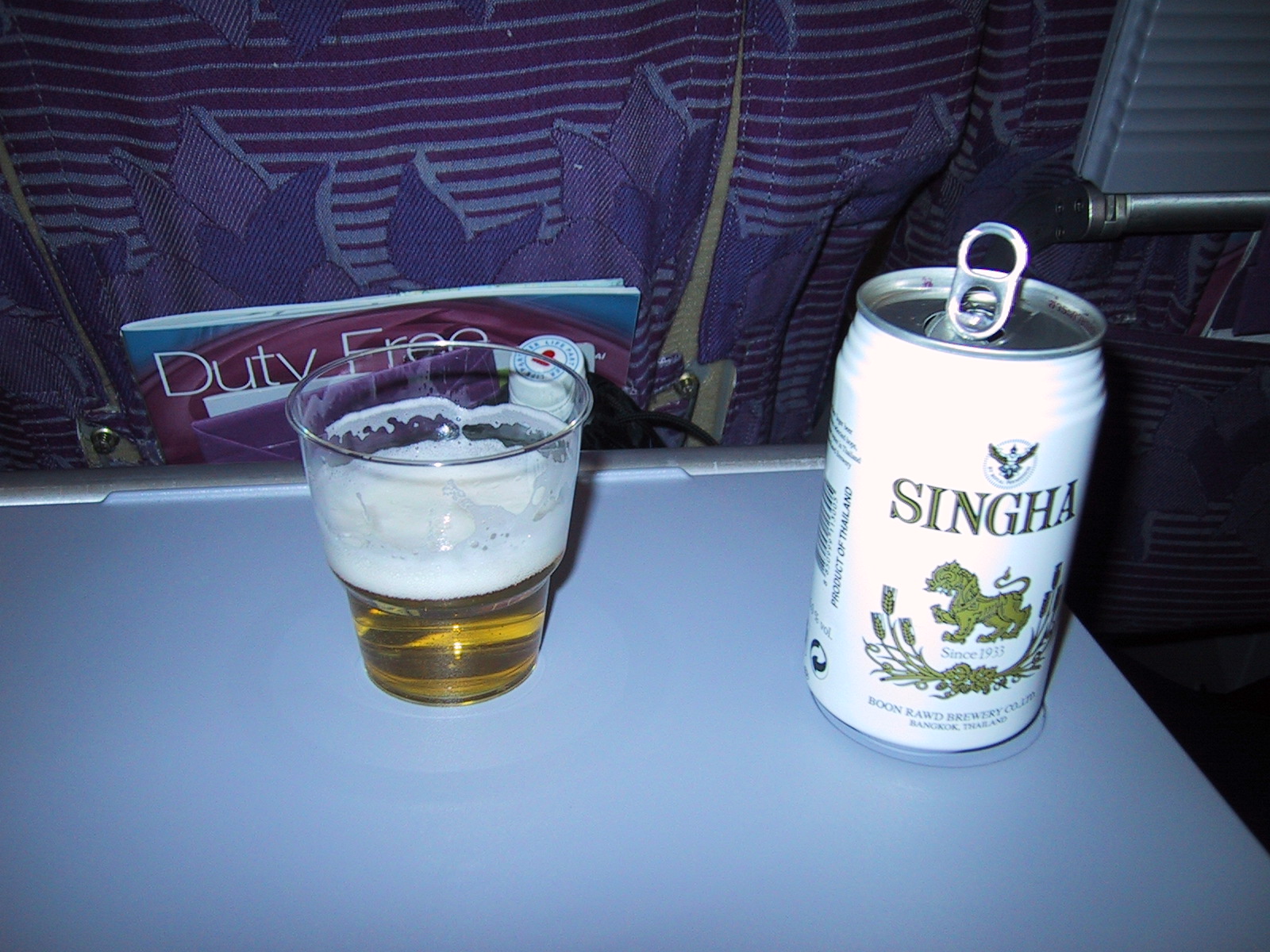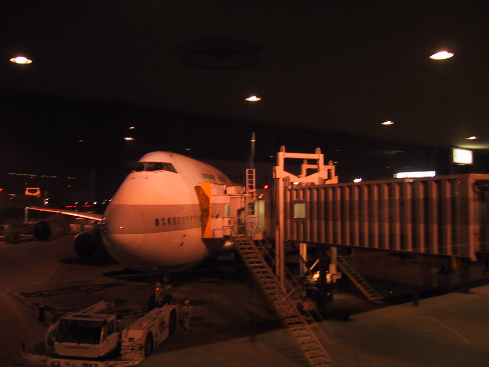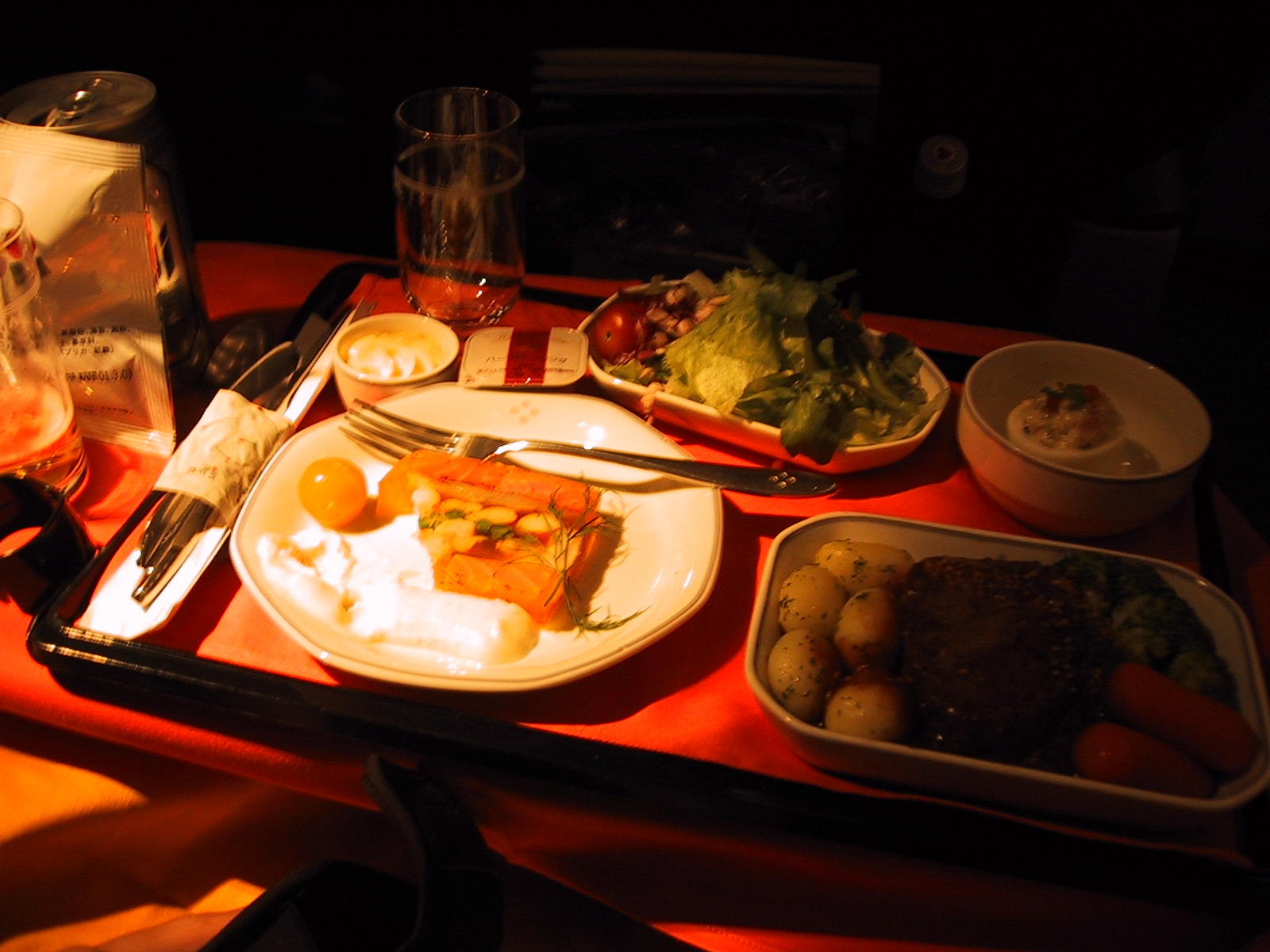 成田へ着くと、予定の便(バンコク行きTG773)は19:10から20:55に 使用機の遅れで変更されたとのこと。これでは次の便(ミュンヘン行きTG924)に 間に合わない(乗り継ぎは50分しかない)ので交渉したところ、 運のいいことにJL707(バンコク行き18:30発)に変更してもらえた。 それもビジネスクラス。
