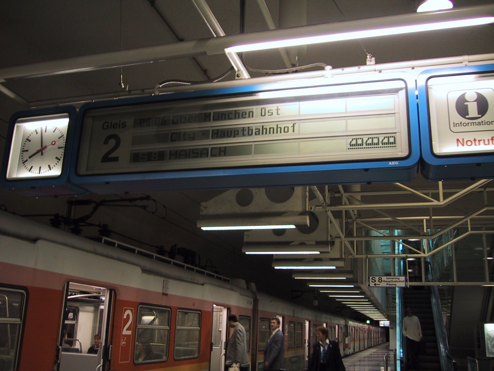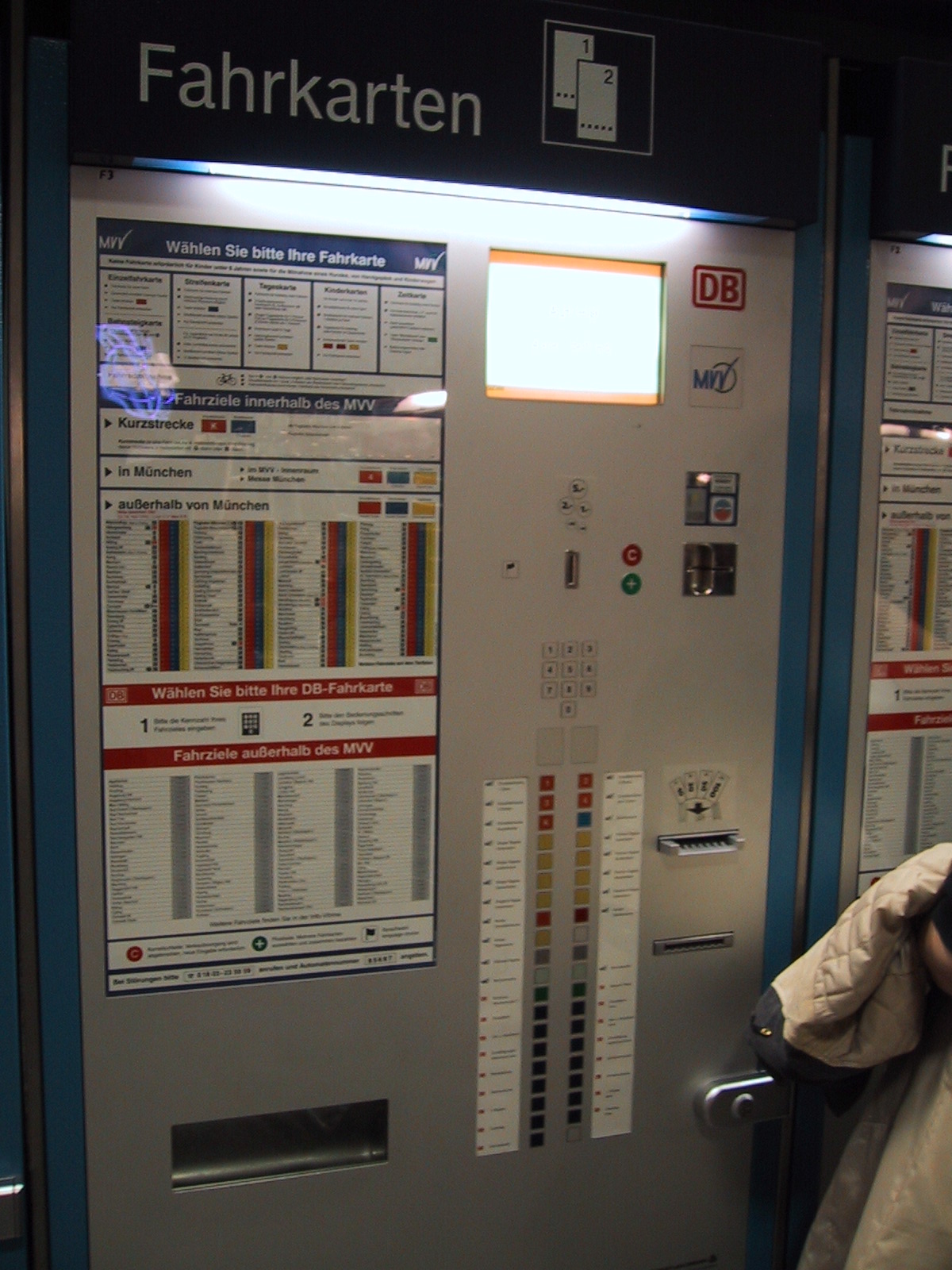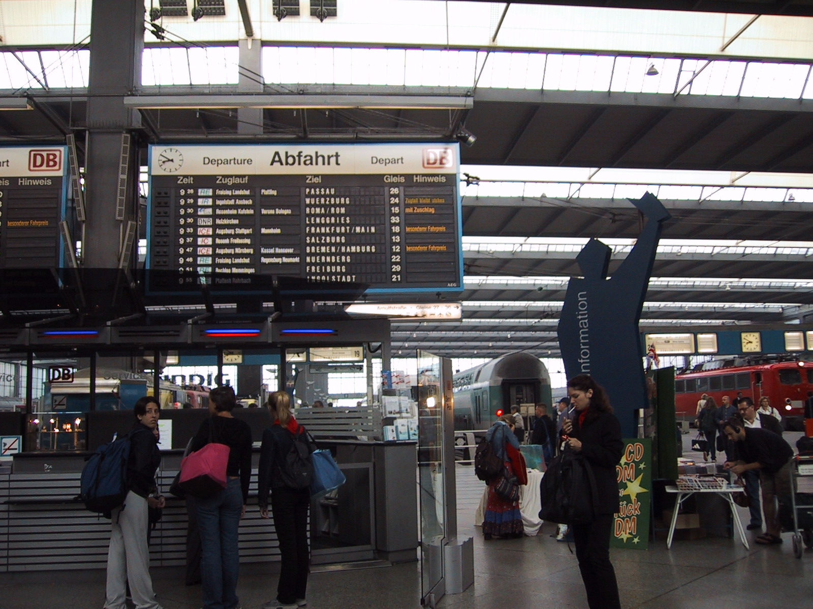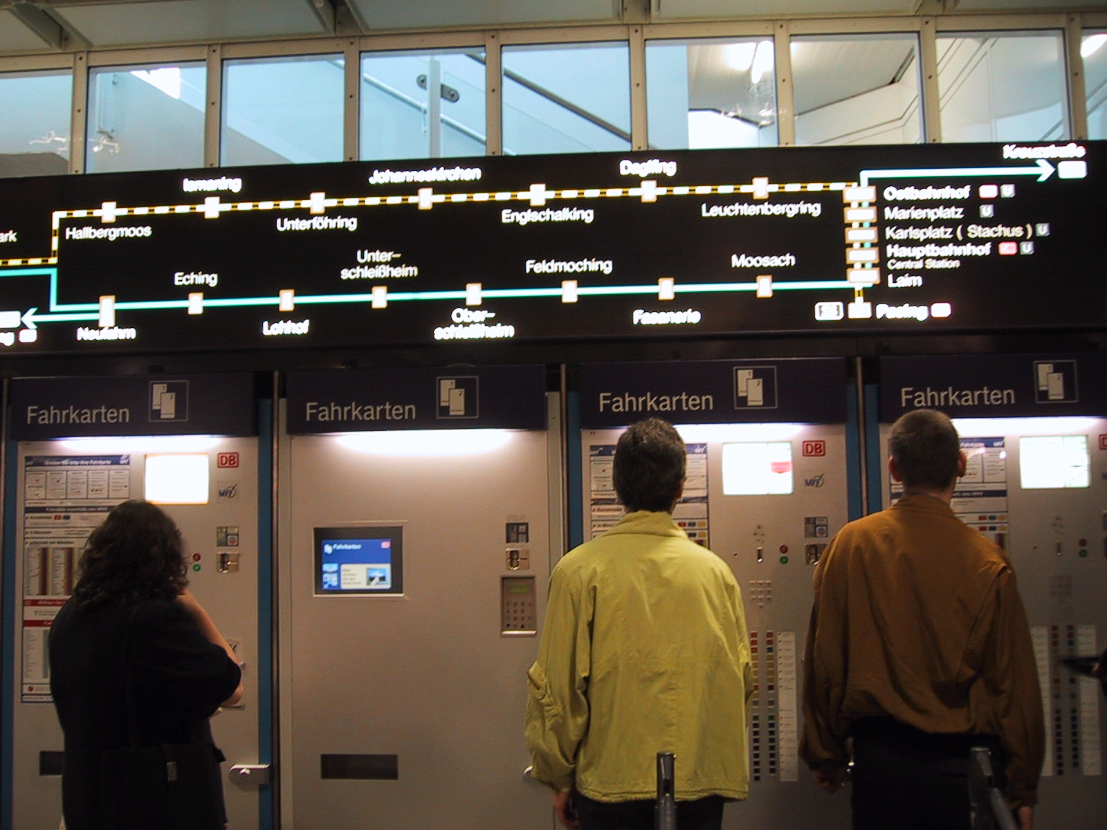 とりあえずミュンヘンの中央駅(Hauptbahnhof)に向かおうとするが、 何故かうまく切符が買えない。15.20DMに対して10DM札×2を入れようとするが、 最初の一枚を入れると次の一枚を受け付けなくなる。結局つり銭切れだった らしく、別の機械を使えばOK。