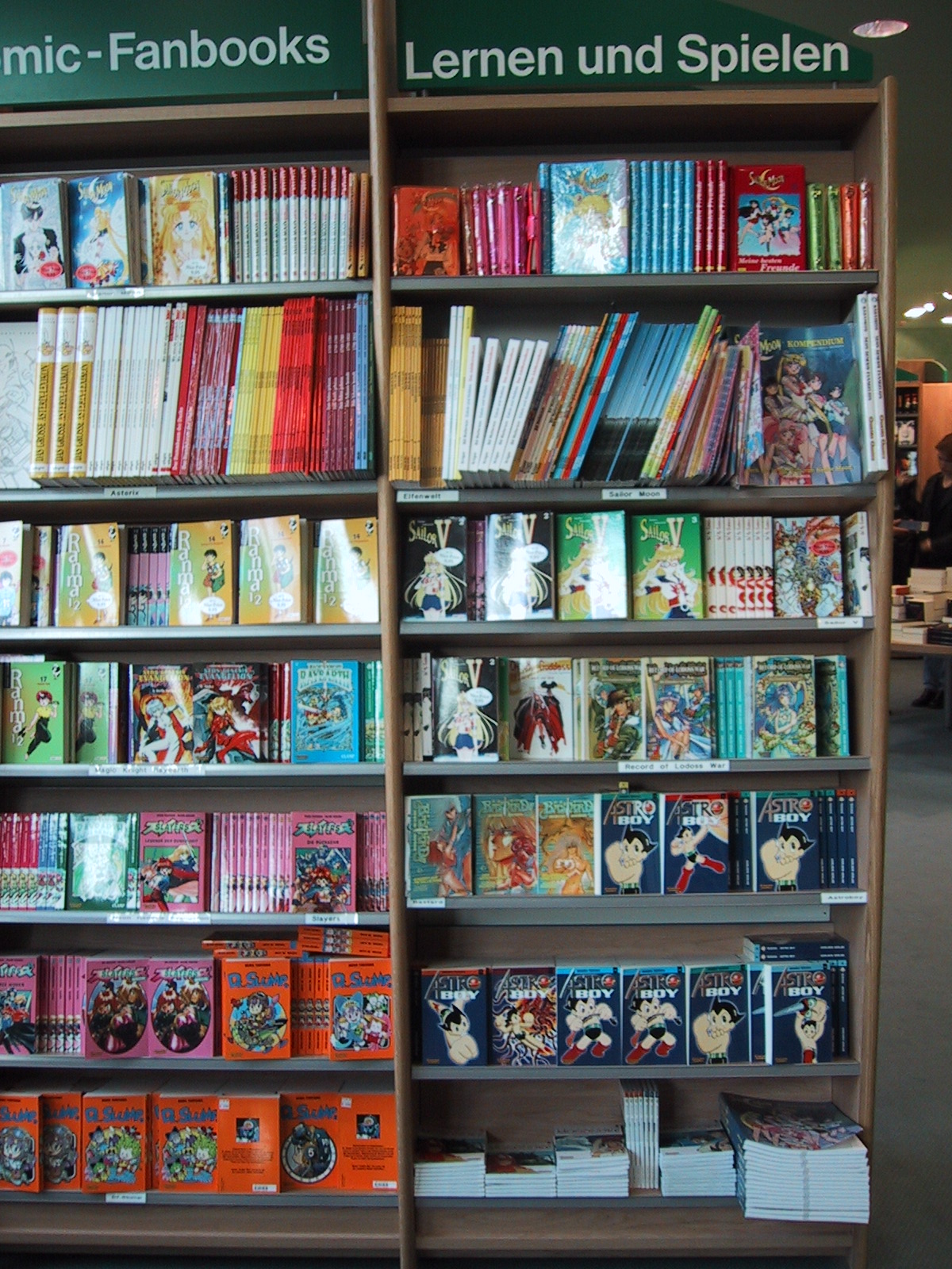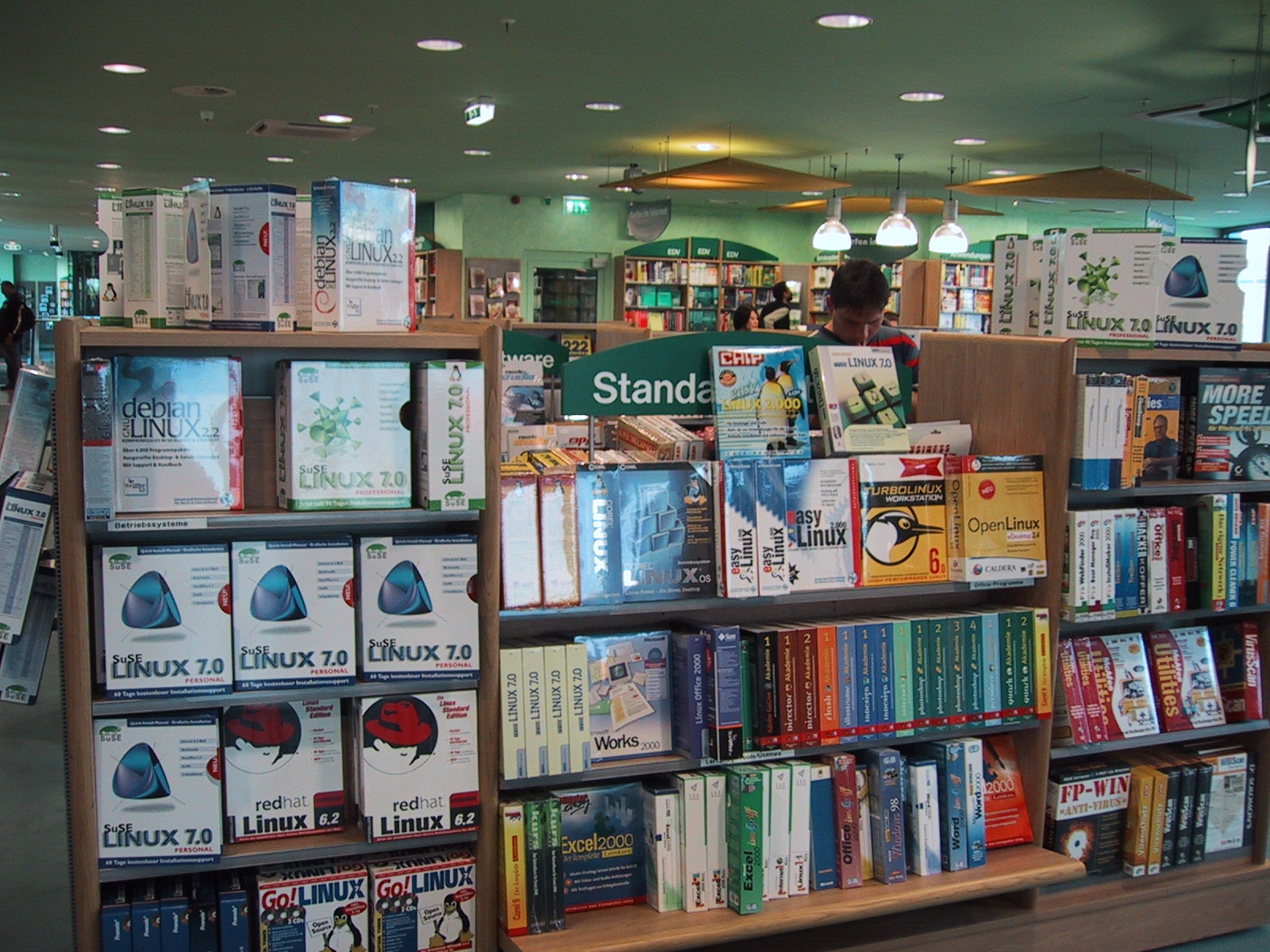 これはLinux売り場。さすがドイツでSuSE Linuxが一番人気らしい。 FreeBSDは影も形も無かった...