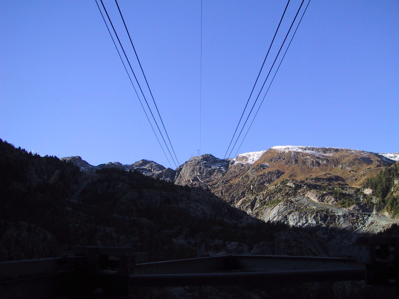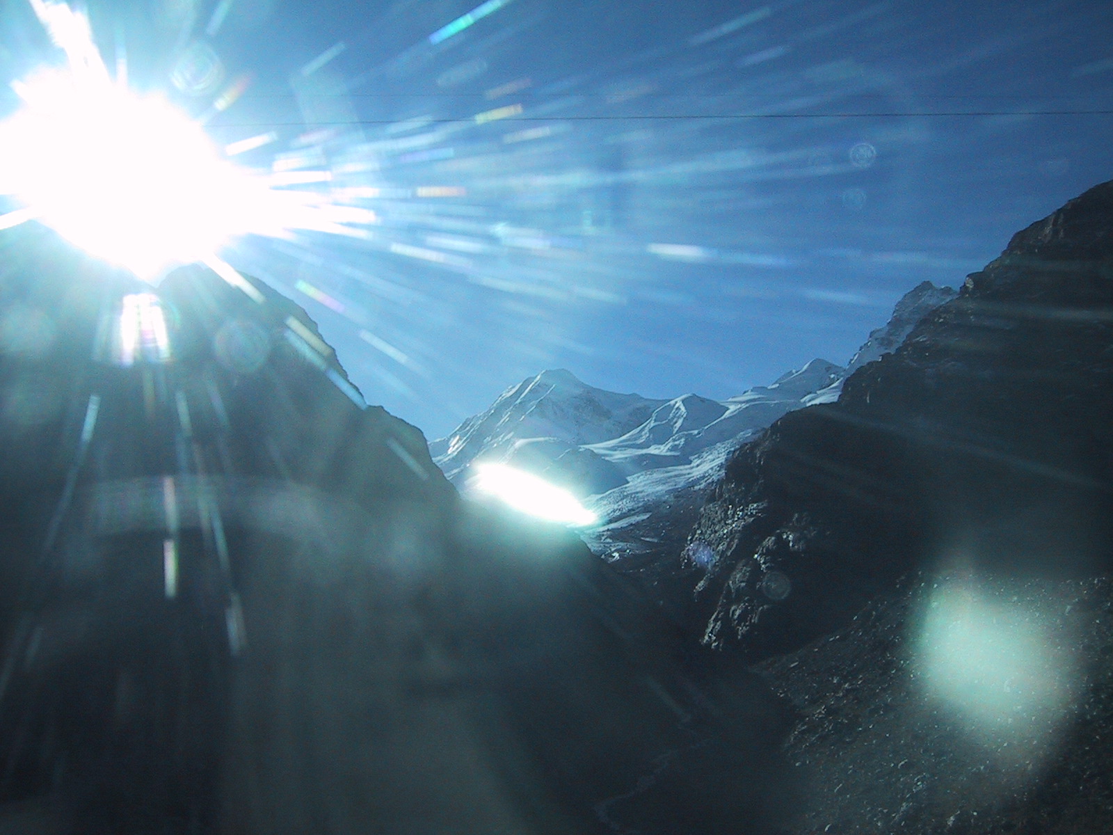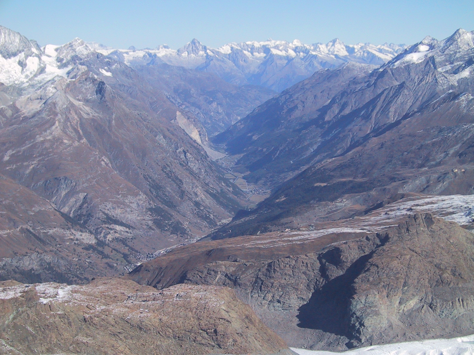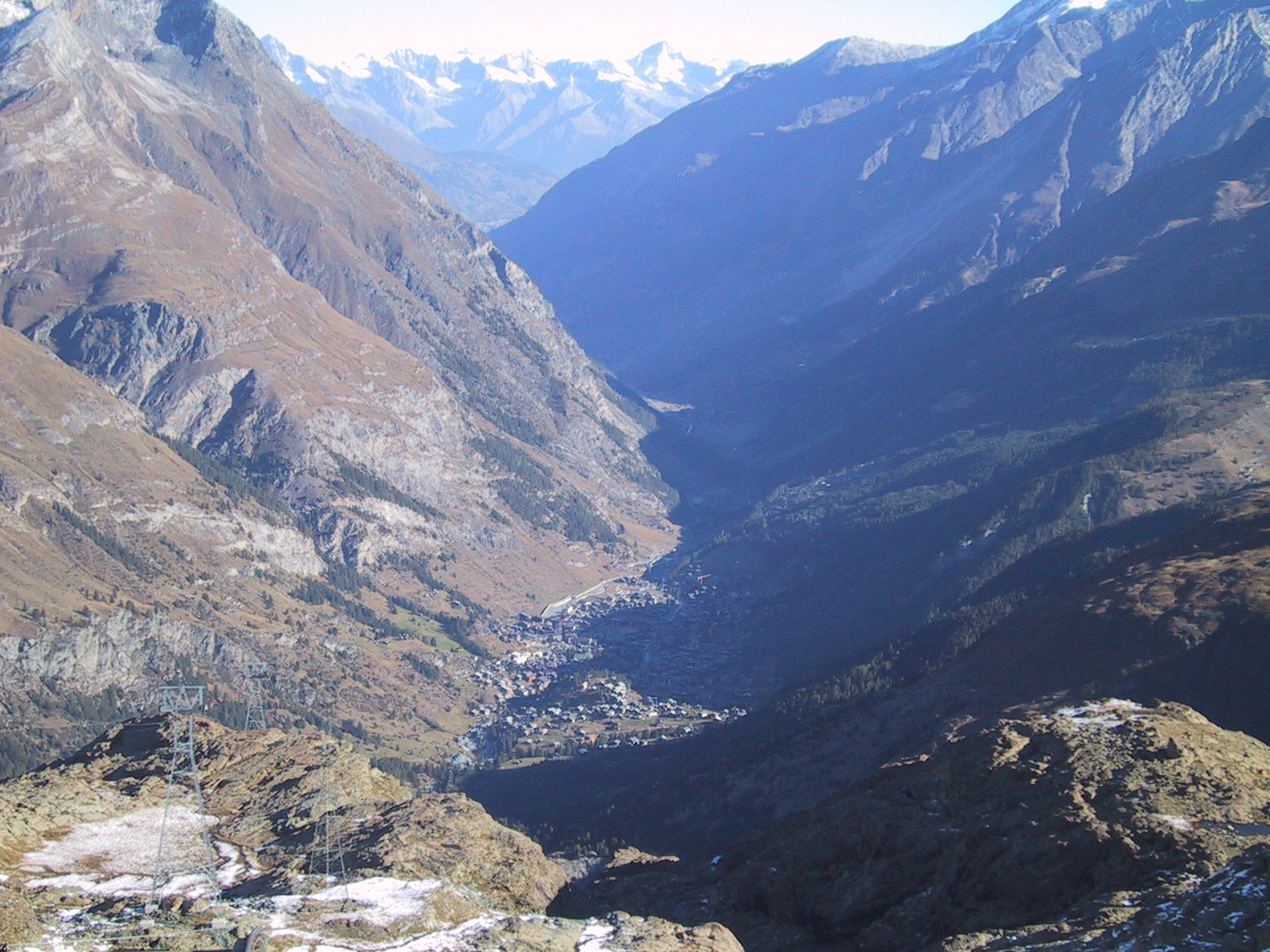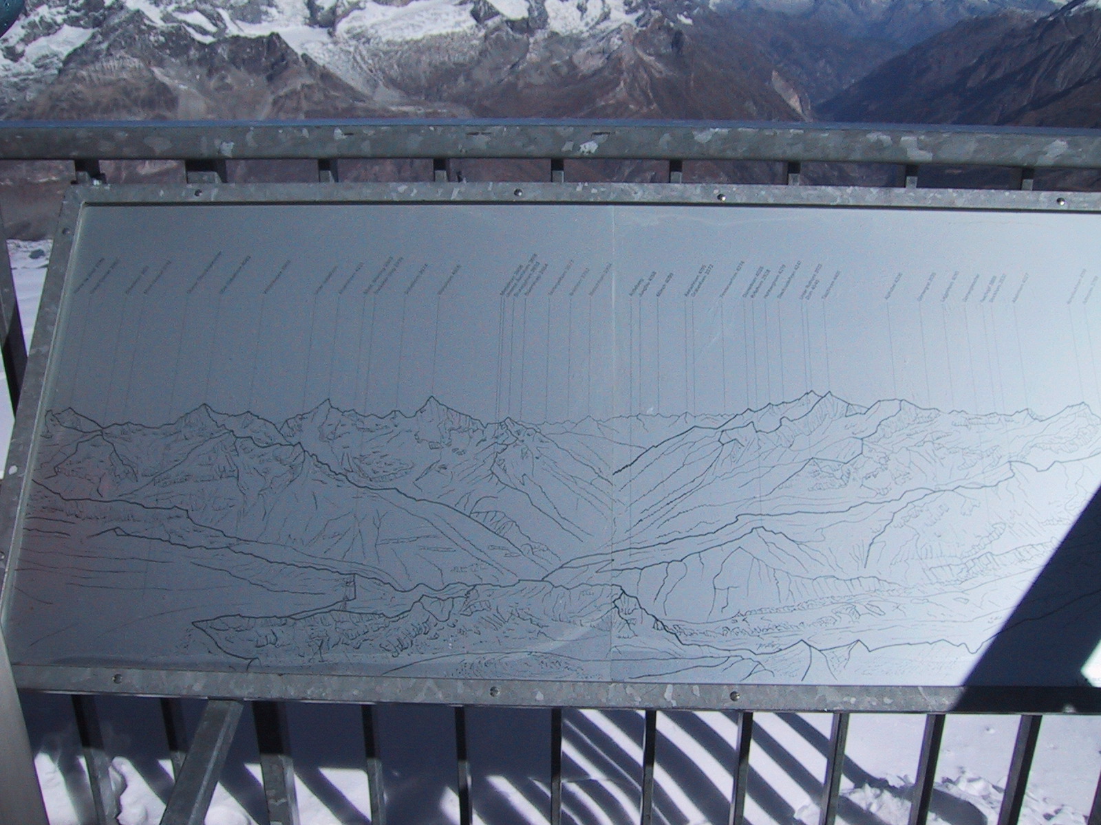 見える山は、左から アルプフーベルAlphubel(4206m)、 アラリンホルンAllalinhorn(4027m)、 リンプフィッシュホルンRimpfischhorn(4199m)、 シュトラールホルンStrahlhorn(4190m)。 ウンターロートホルンUnterrothorn(3103m)、 オーバーロートホルンOberrothorn(3415m)、 シュトックホルンStockhorn(3532m)、 ゴルナーグラートGornergrat(3090m)も見える。