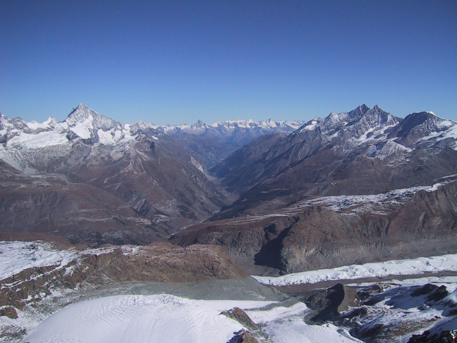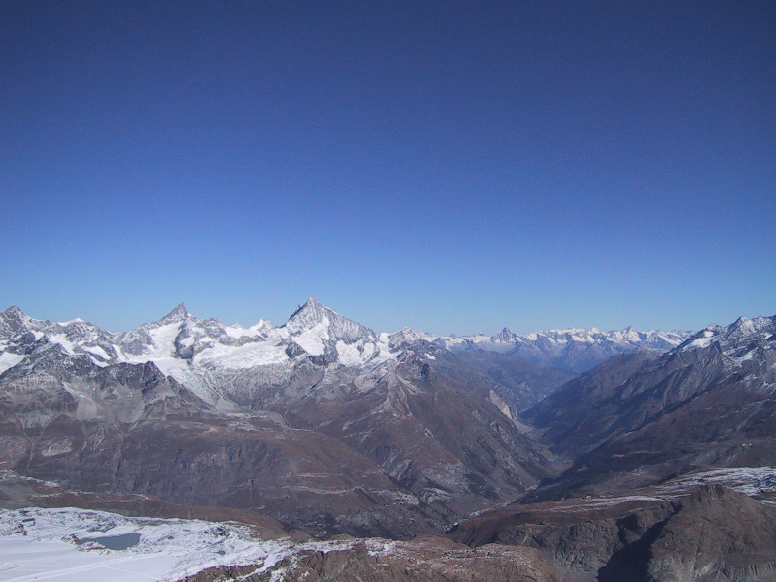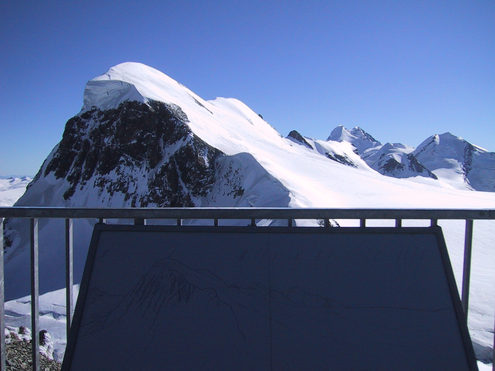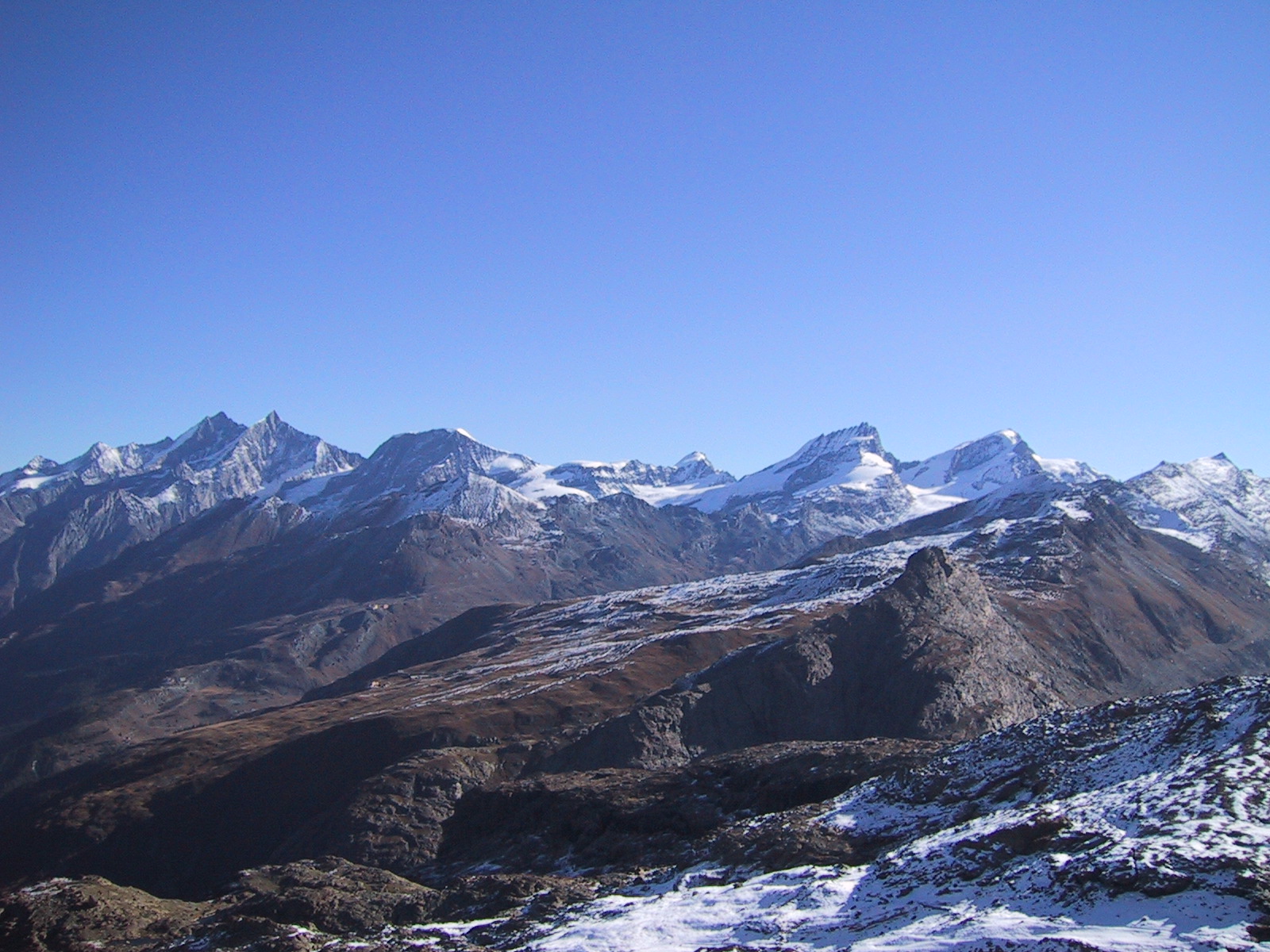 見える山は、左から ドムDom(4545m)、 テッシュホルンT\:a schhorn(4490m)、 アルプフーベルAlphubel(4206m)、 アラリンホルンAllalinhorn(4027m)、 リンプフィッシュホルンRimpfischhorn(4199m)、 シュトラールホルンStrahlhorn(4190m)。 ウンターロートホルンUnterrothorn(3103m)、 オーバーロートホルンOberrothorn(3415m)、 シュトックホルンStockhorn(3532m)、 ゴルナーグラートGornergrat(3090m)も見える。