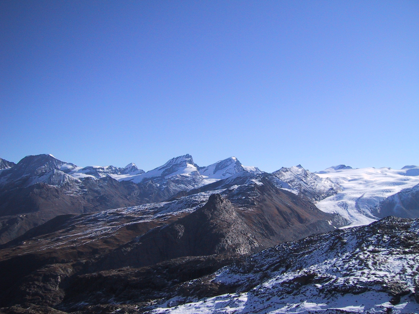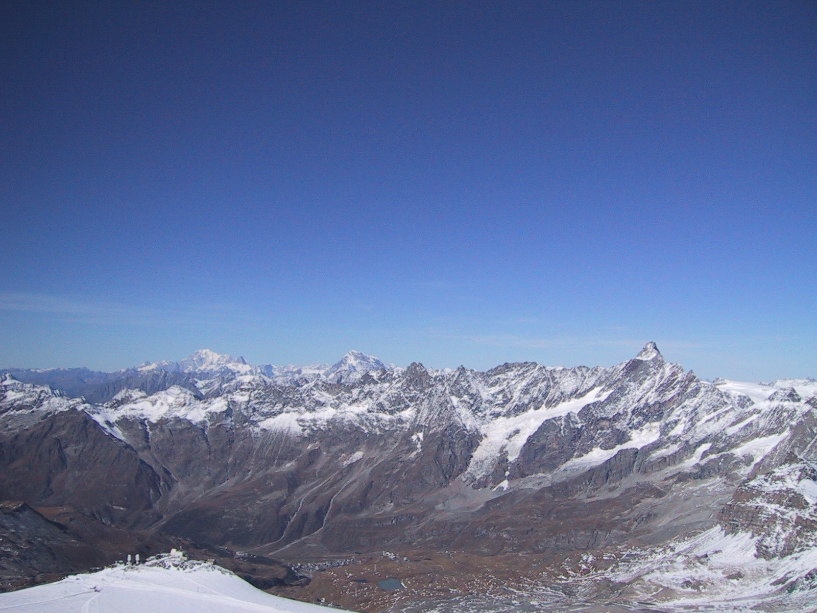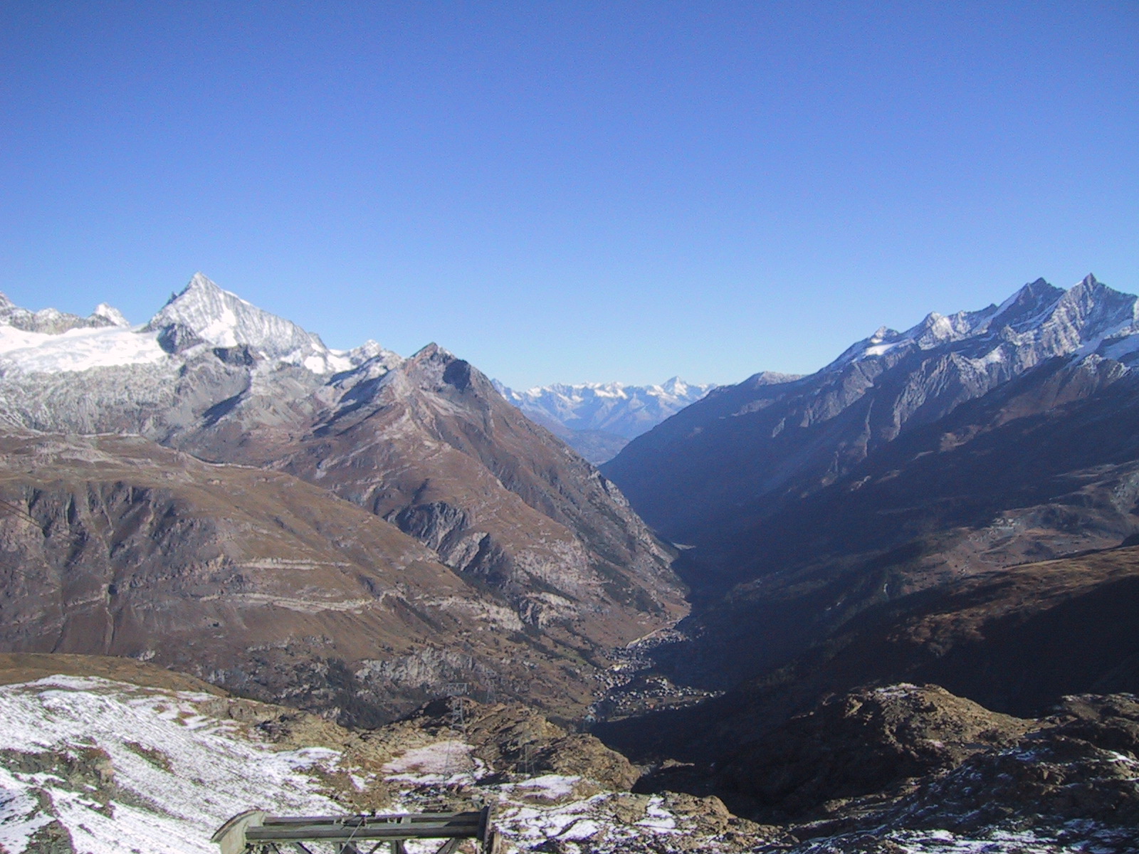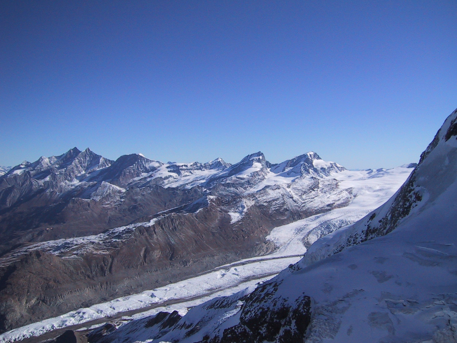 見える山は、左から ドムDom(4545m)、 テッシュホルンT\:a schhorn(4490m)、 アルプフーベルAlphubel(4206m)、 アラリンホルンAllalinhorn(4027m)、 リンプフィッシュホルンRimpfischhorn(4199m)、 シュトラールホルンStrahlhorn(4190m)。 ウンターロートホルンUnterrothorn(3103m)、 オーバーロートホルンOberrothorn(3415m)、 シュトックホルンStockhorn(3532m)、 ゴルナーグラートGornergrat(3090m)も見える。