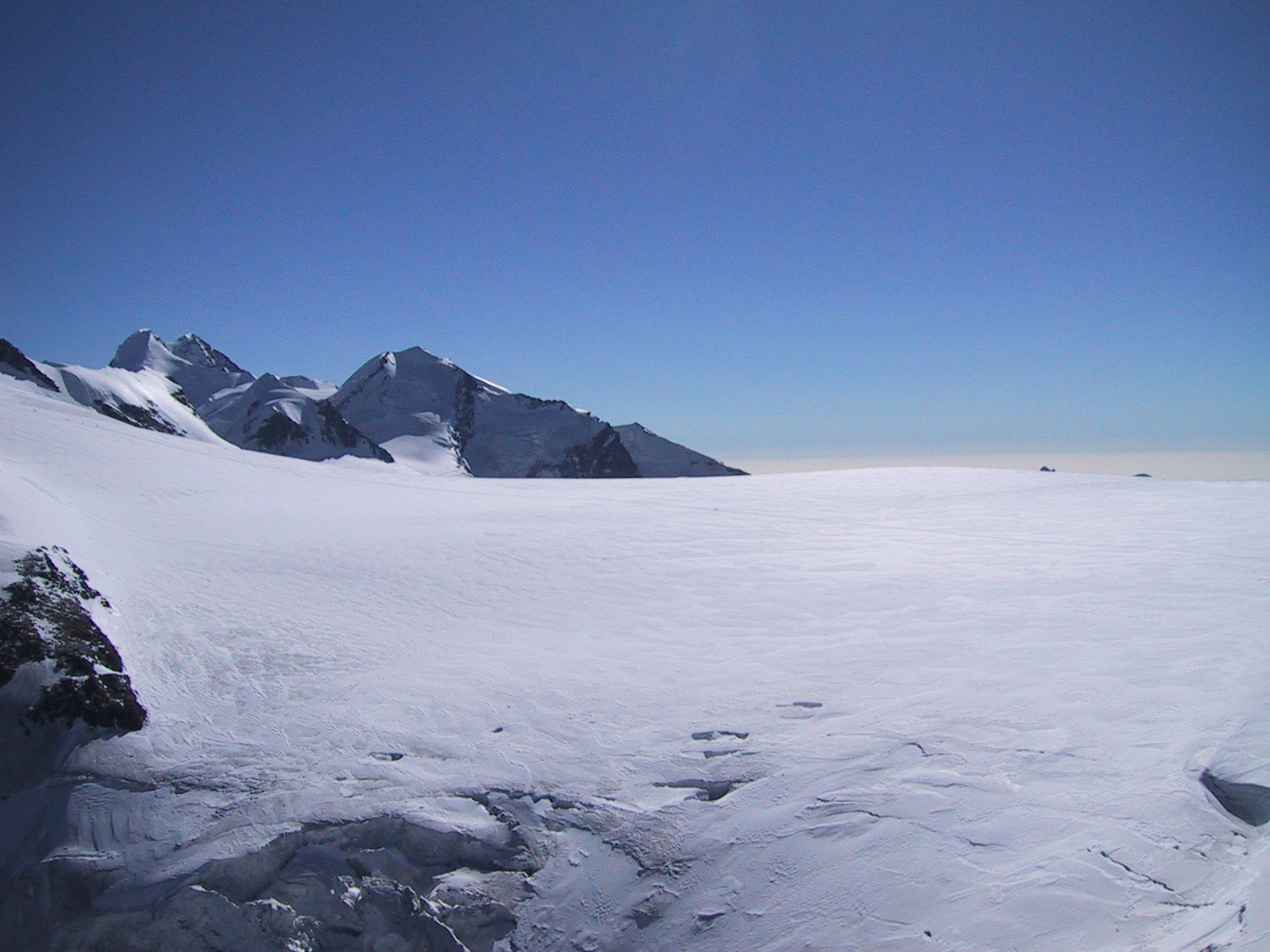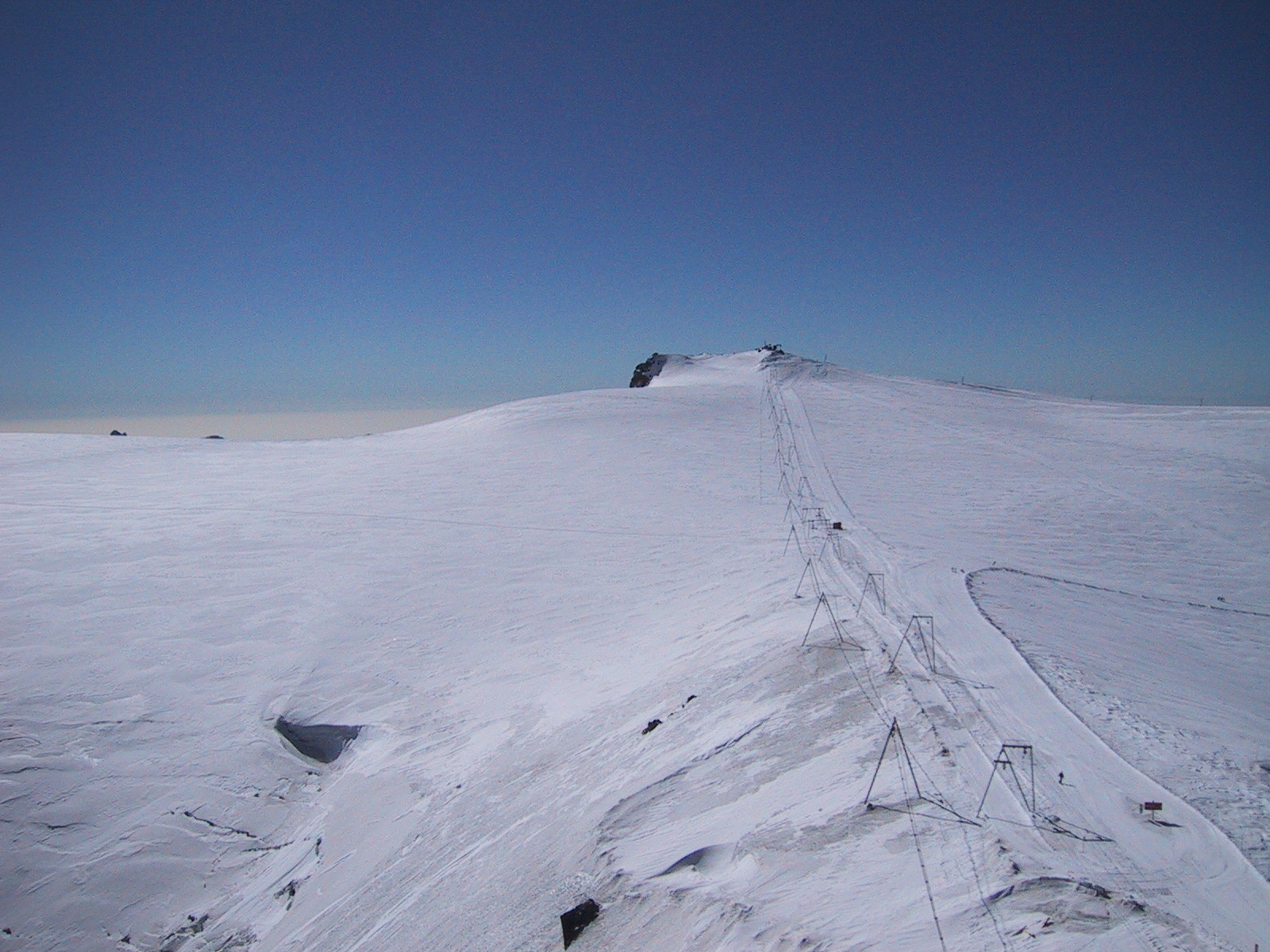 ???との間はスキー場になっていて、Tバーリフトがある。 左へ伸びている踏み跡がブライトホルンBreithorn(4164m)への ルートらしい。