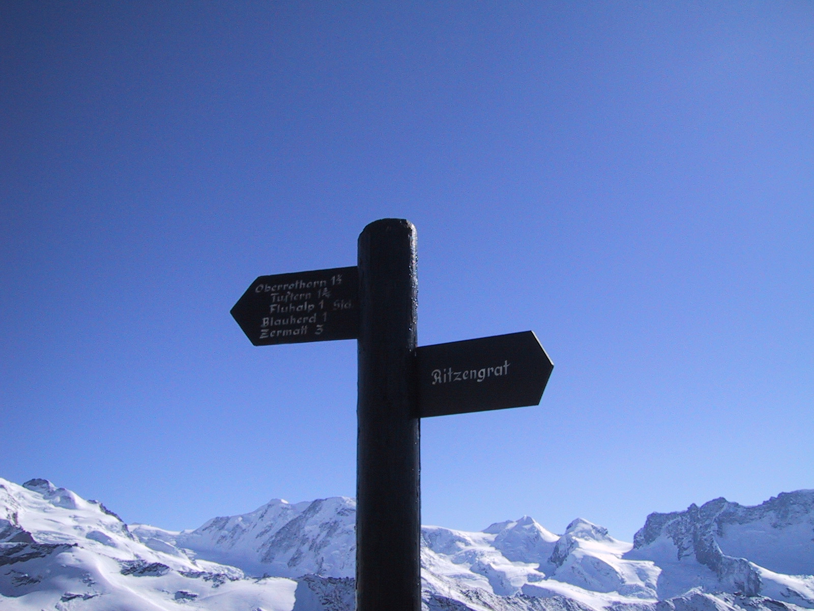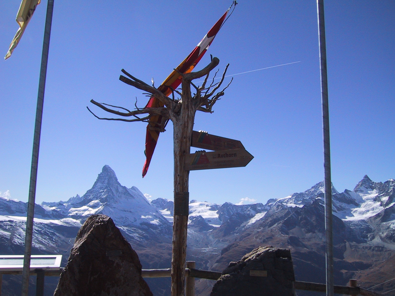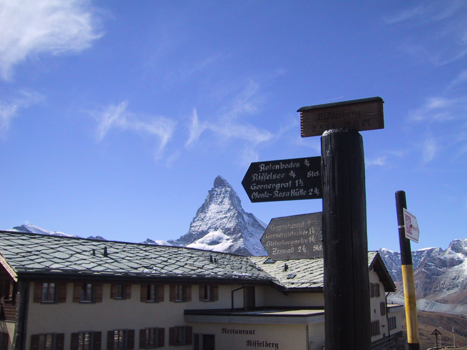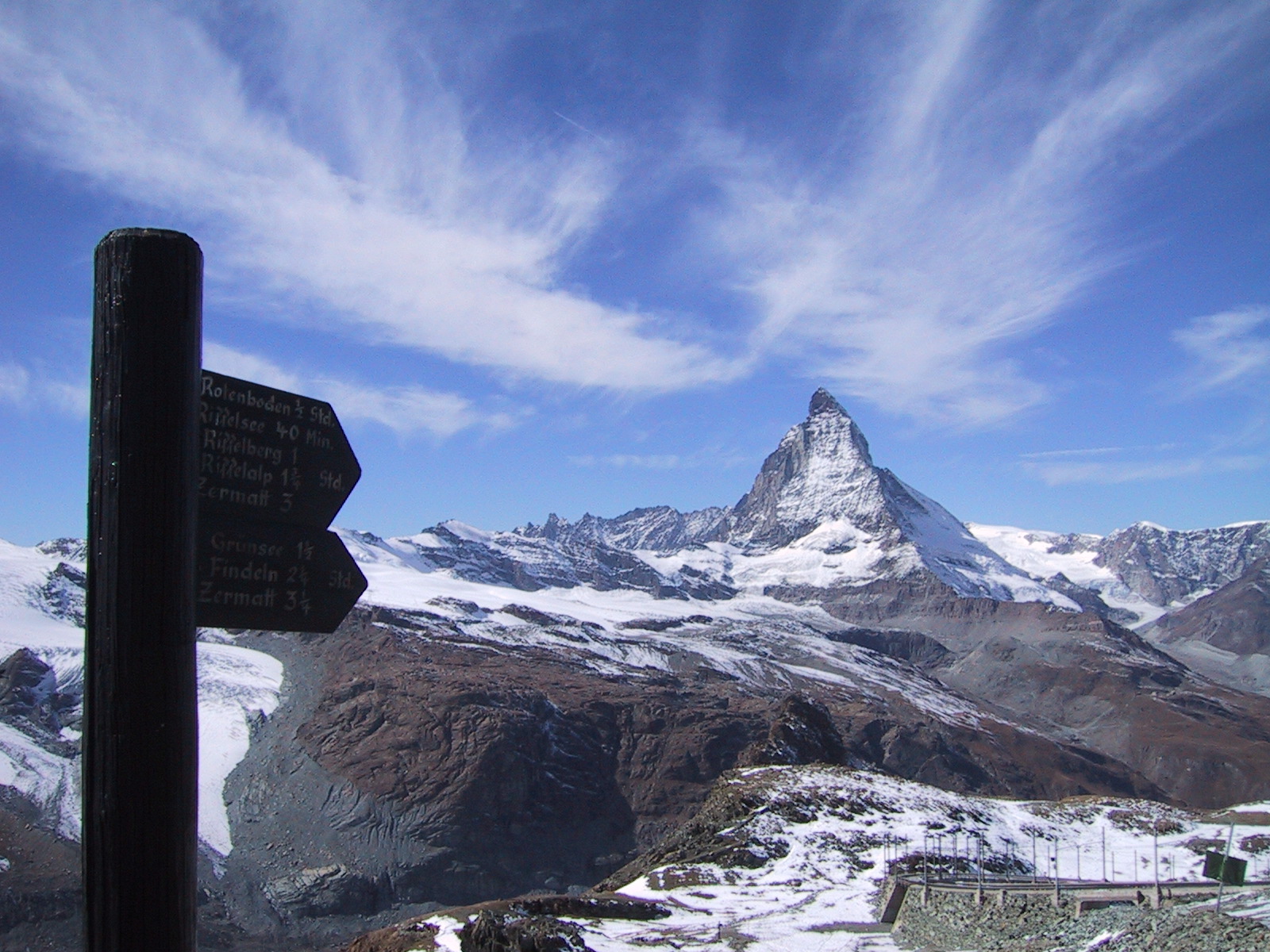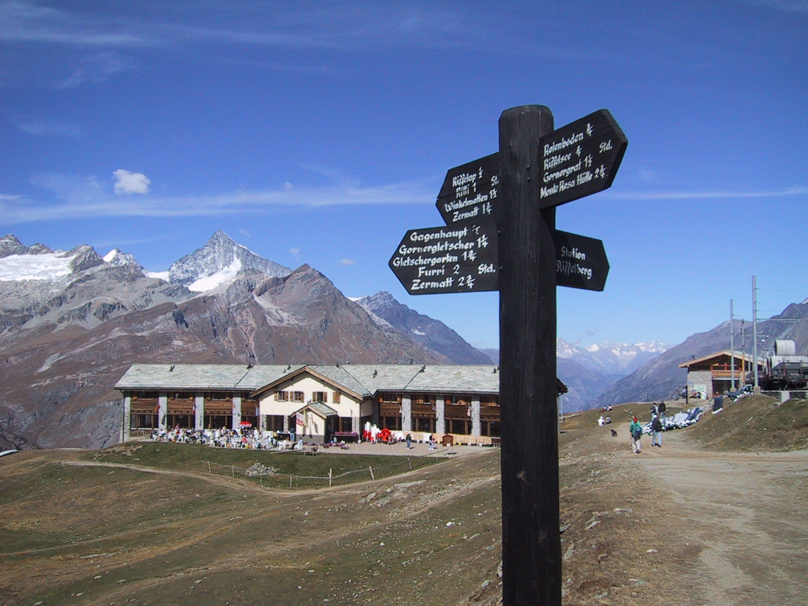 ここからオーバーロートホルンへは1時間半の表示。 持っていたガイドブックによると往復4時間。 現地で買った地図(Wanderkarte)によると、行き80分帰り50分。 しかし、現在15:30で、ロープウェイの最終は17:30らしい。 ここであきらめるのも勿体無いし、体調は非常にいいので、 とにかく歩いて山頂を目指し、1時間たったら引き返すことにする。