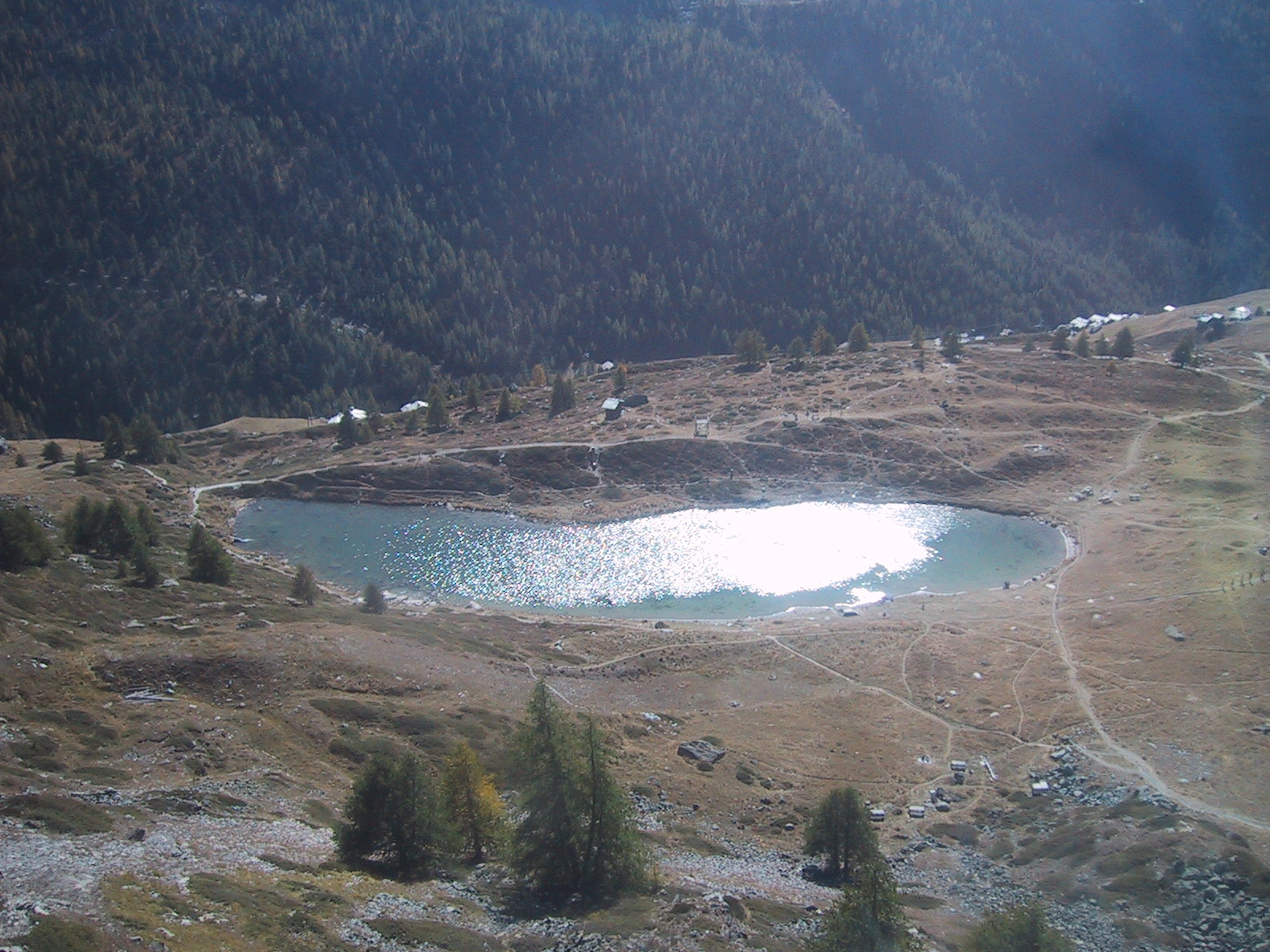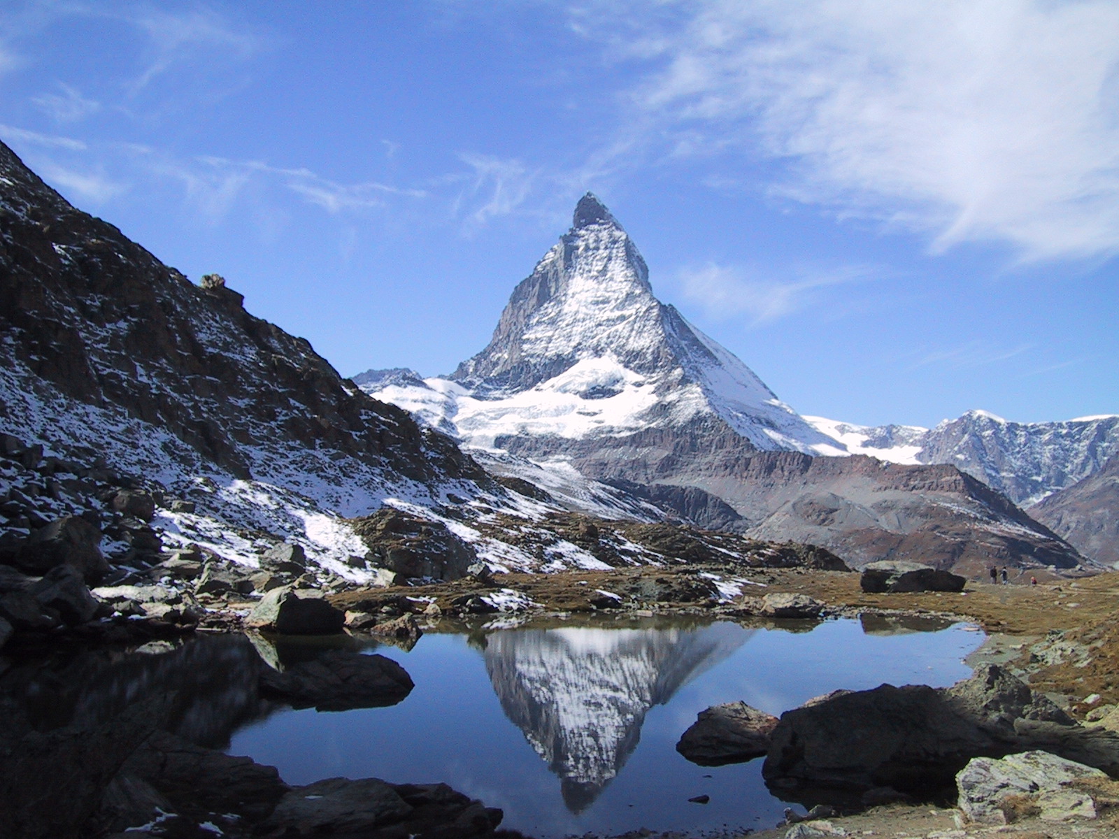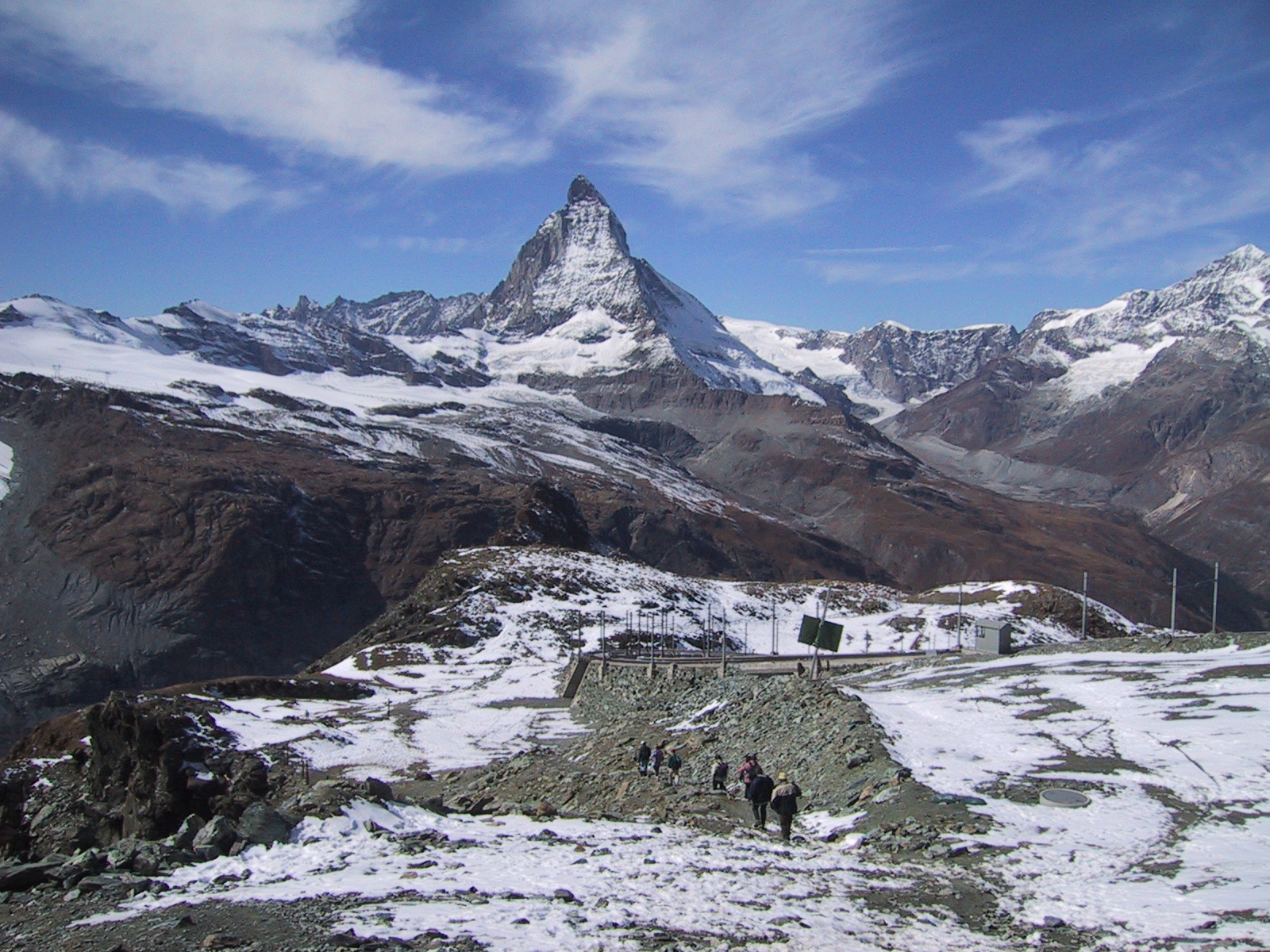 ゴルナーグラートで腹ごしらえも済んだので、少し気楽にハイキング。 一つ下の駅のローテンボーデンRotenBoden(2815m)まで歩き、その 近くの湖、リッフェルゼーRiffelsee(2757m)を訪ねることにする。 リッフェルゼーは逆さマッターホルンが美しく見られる 湖として観光客に人気が高いところ。