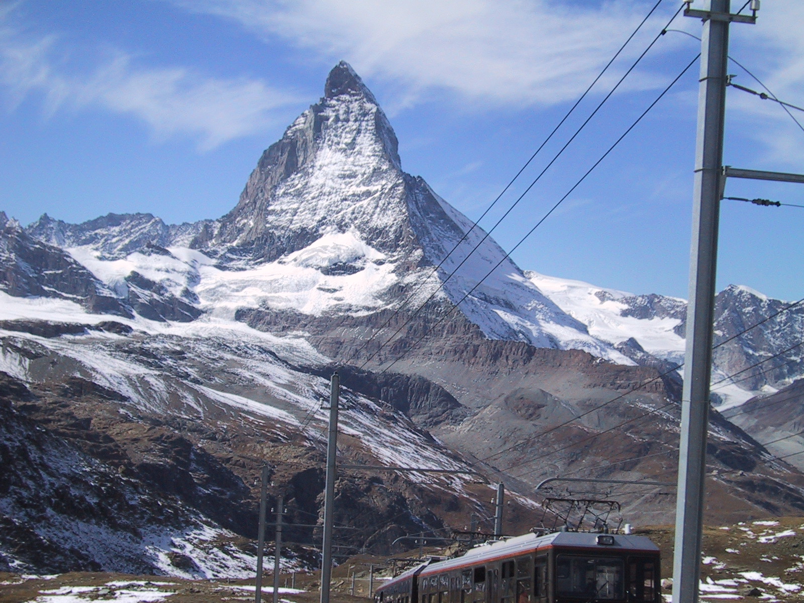 マッターホルンとゴルナーグラート鉄道。 日本では山の中で人工物を見ると興ざめするものだが、 不思議とスイスでは美しい風景と感じてしまう。