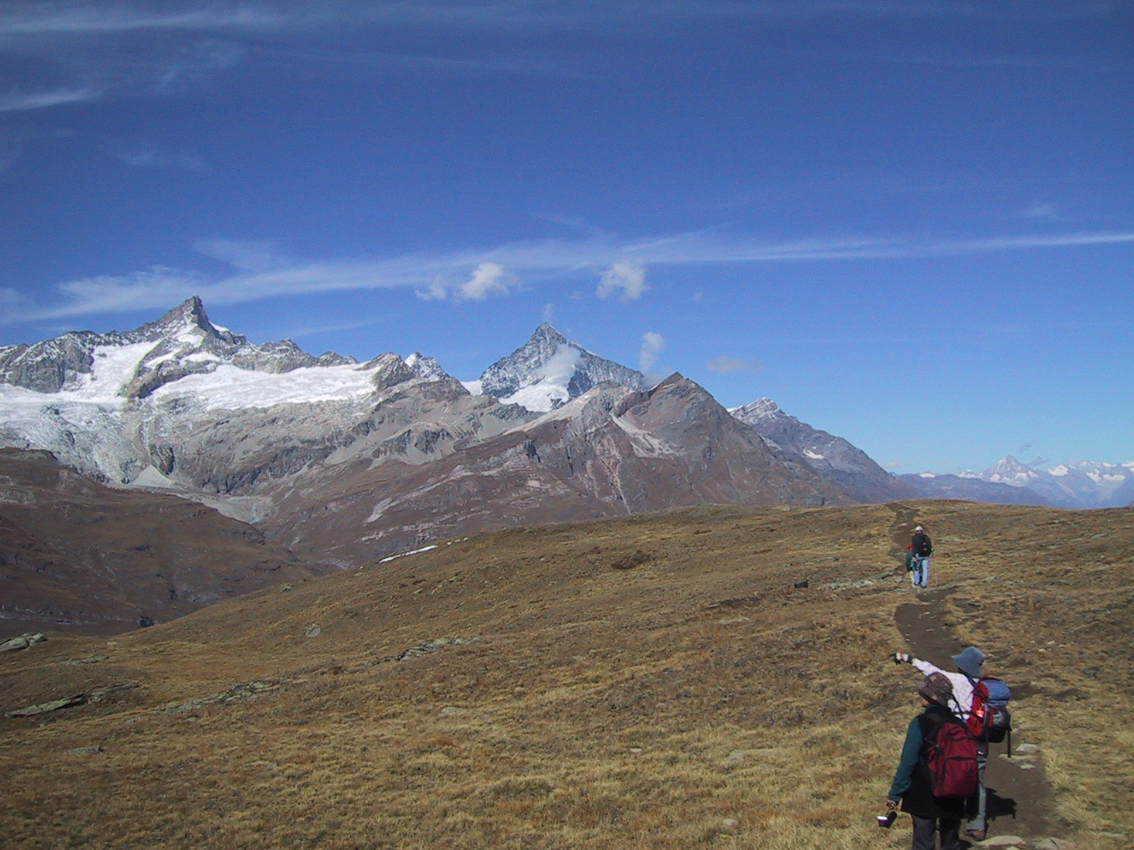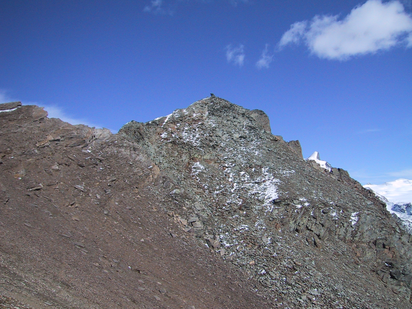 ここまで上がって来ると、ゴルナーグラートの稜線の向こうの山々 (これはブライトホルンとクラインマッターホルン)が見えて来る。