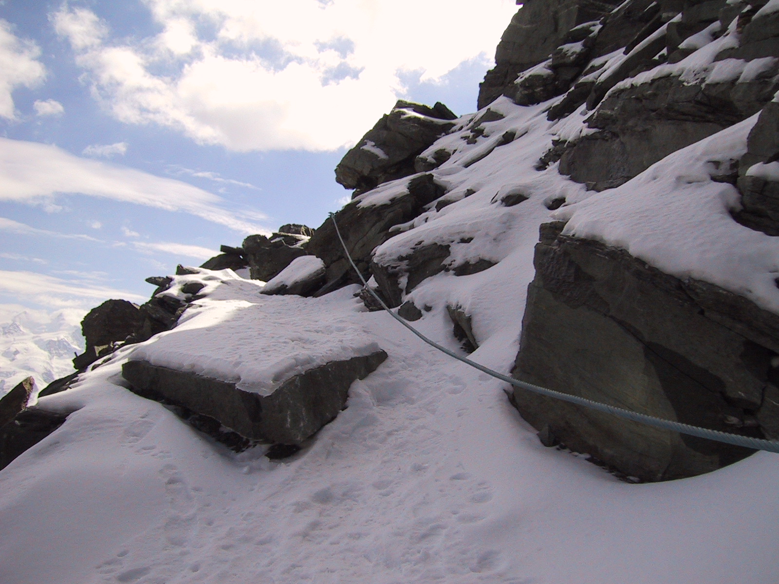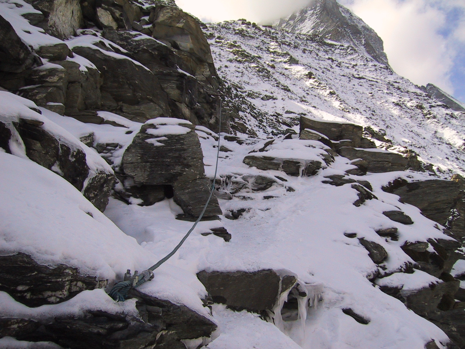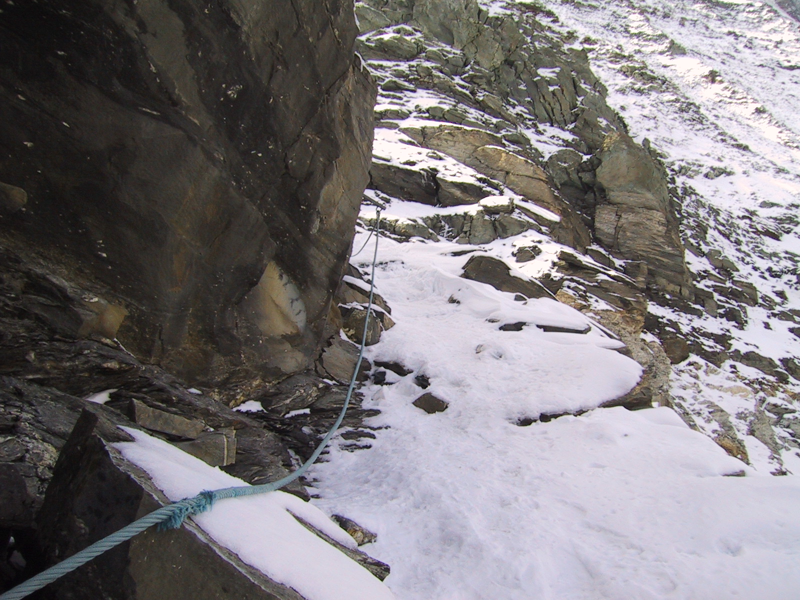 ついにロープが出現。雪も岩に薄く付いているため剥がれやすく、 道はとても一般コースとは思えない恐い状況。