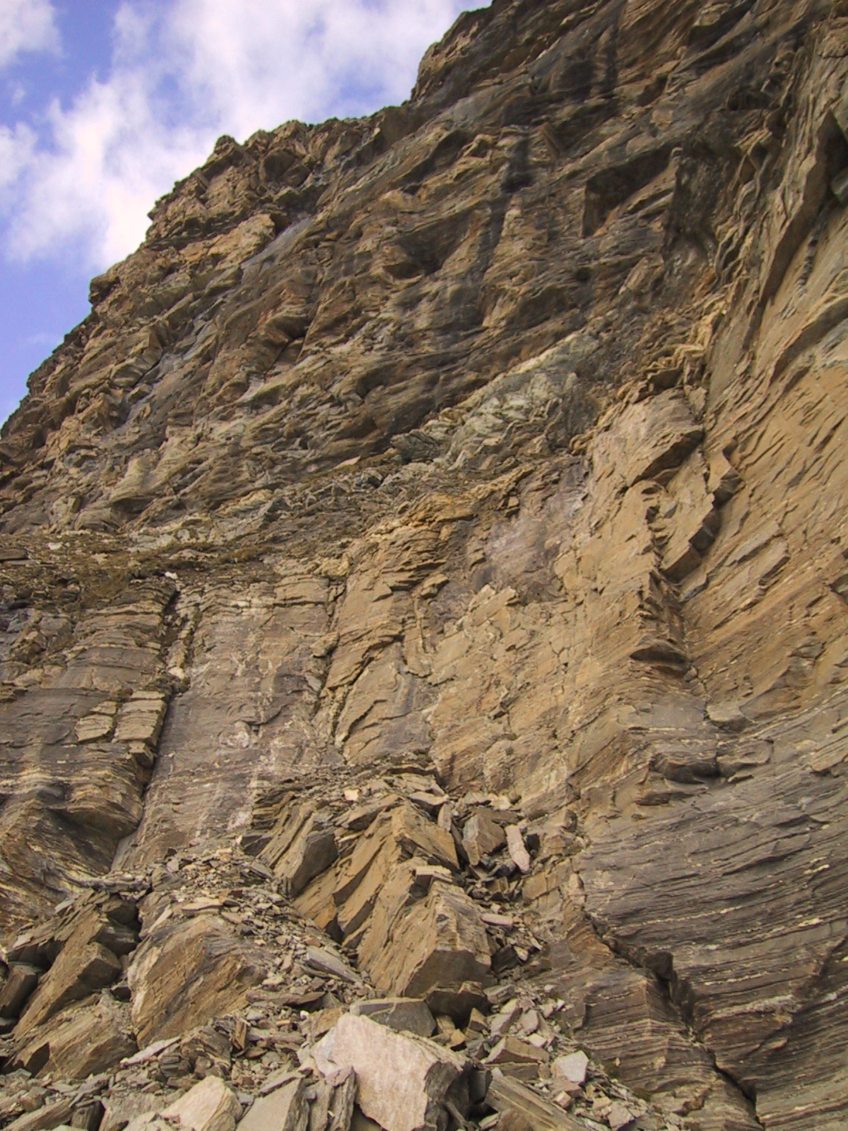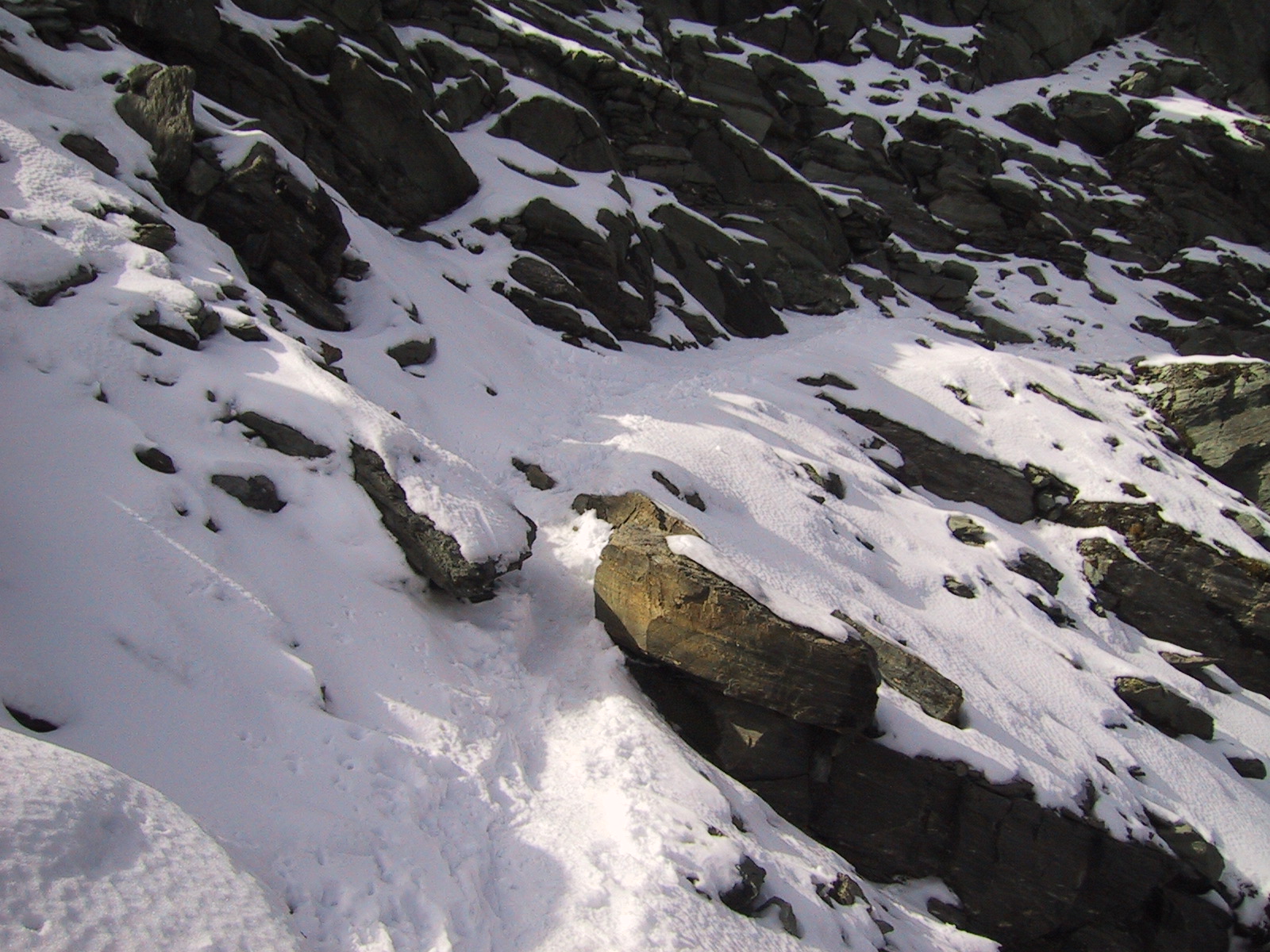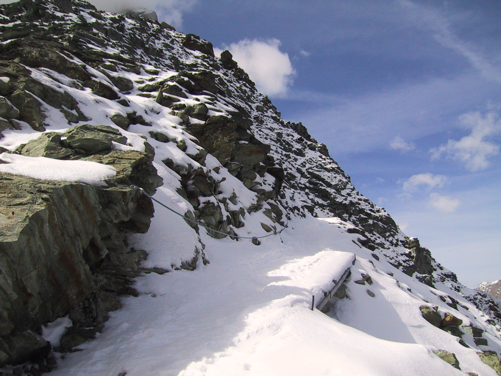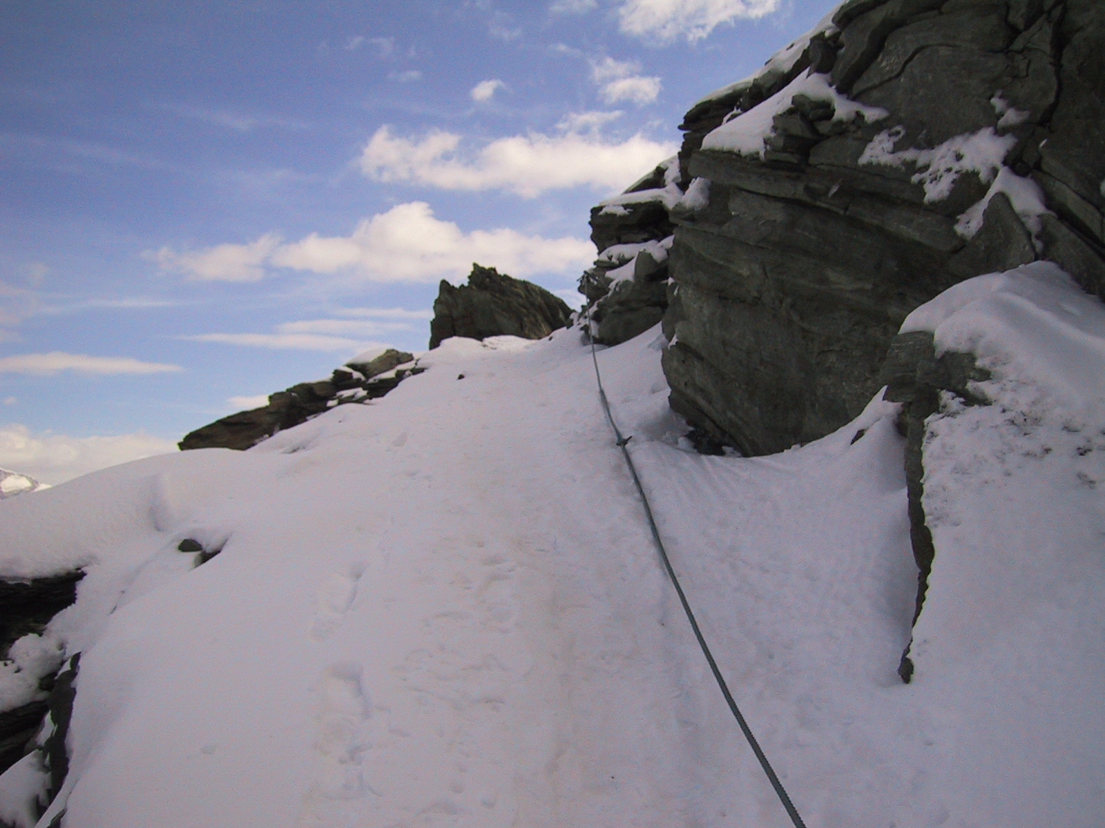 ついにロープが出現。雪も岩に薄く付いているため剥がれやすく、 道はとても一般コースとは思えない恐い状況。