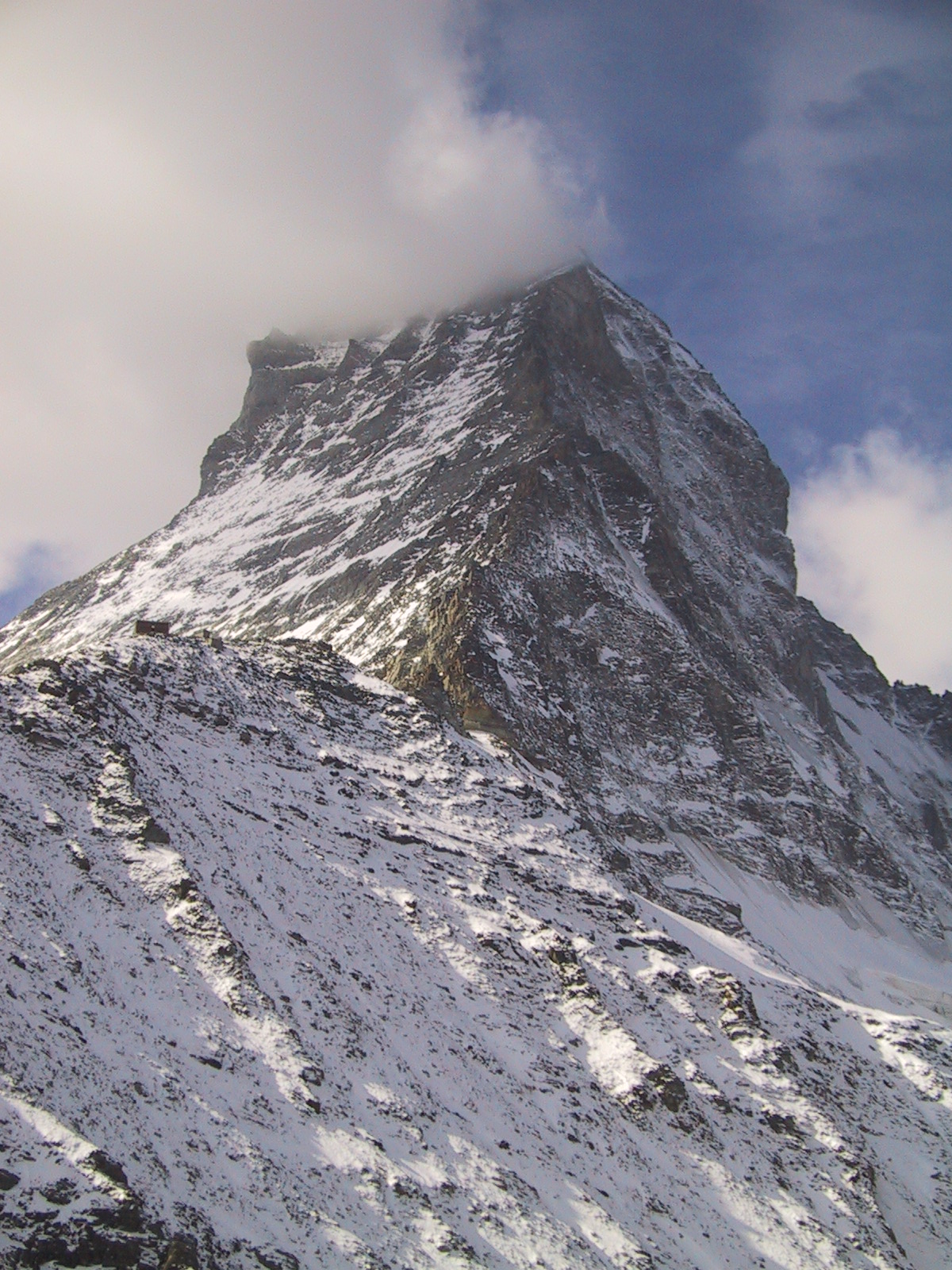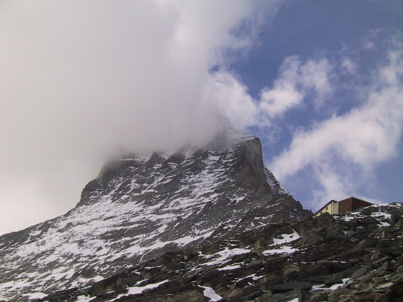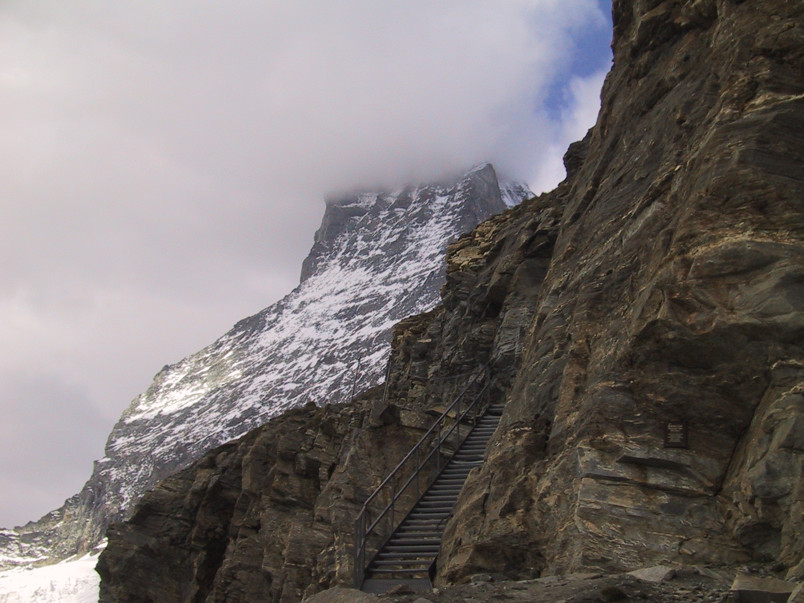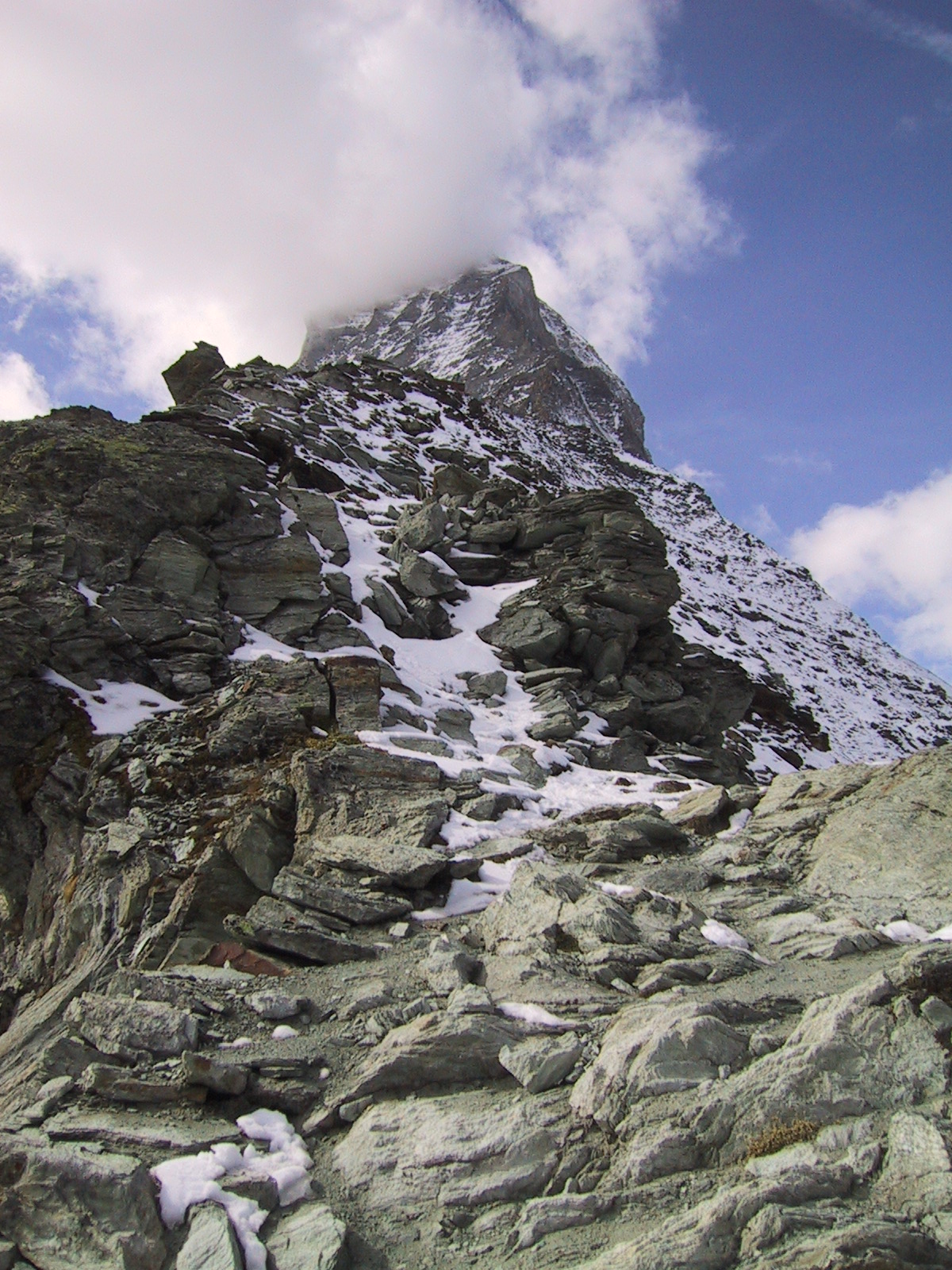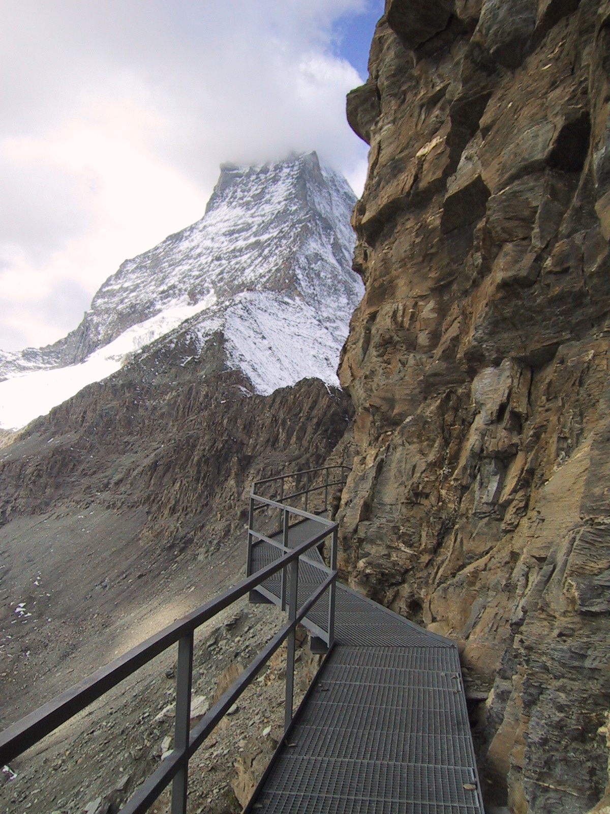 この日は残念ながらあまり天気は良くない。マッターホルンは雲を 被っている。しかし、予定通りマッターホルンのヘルンリ稜にある マッターホルンのベースとなる山小屋、 ヘルンリヒュッテH\:o rnlih\:u tte(3260m)を目指し、 マッターホルンに自分の力で行けるところまで近づくことにする。
