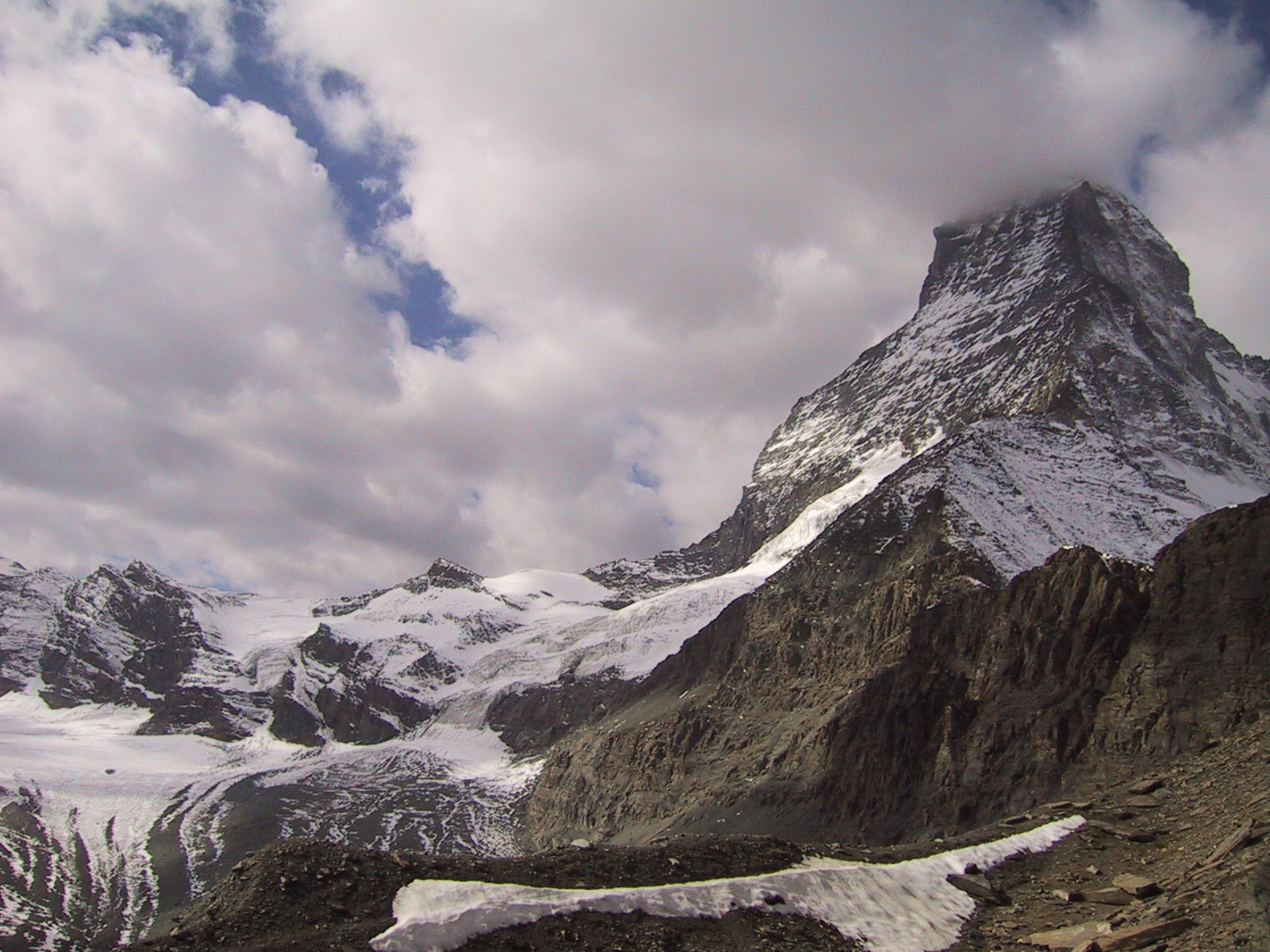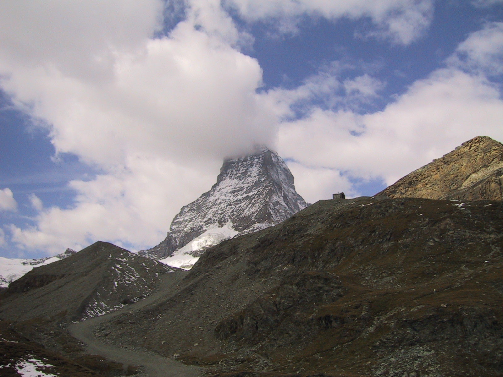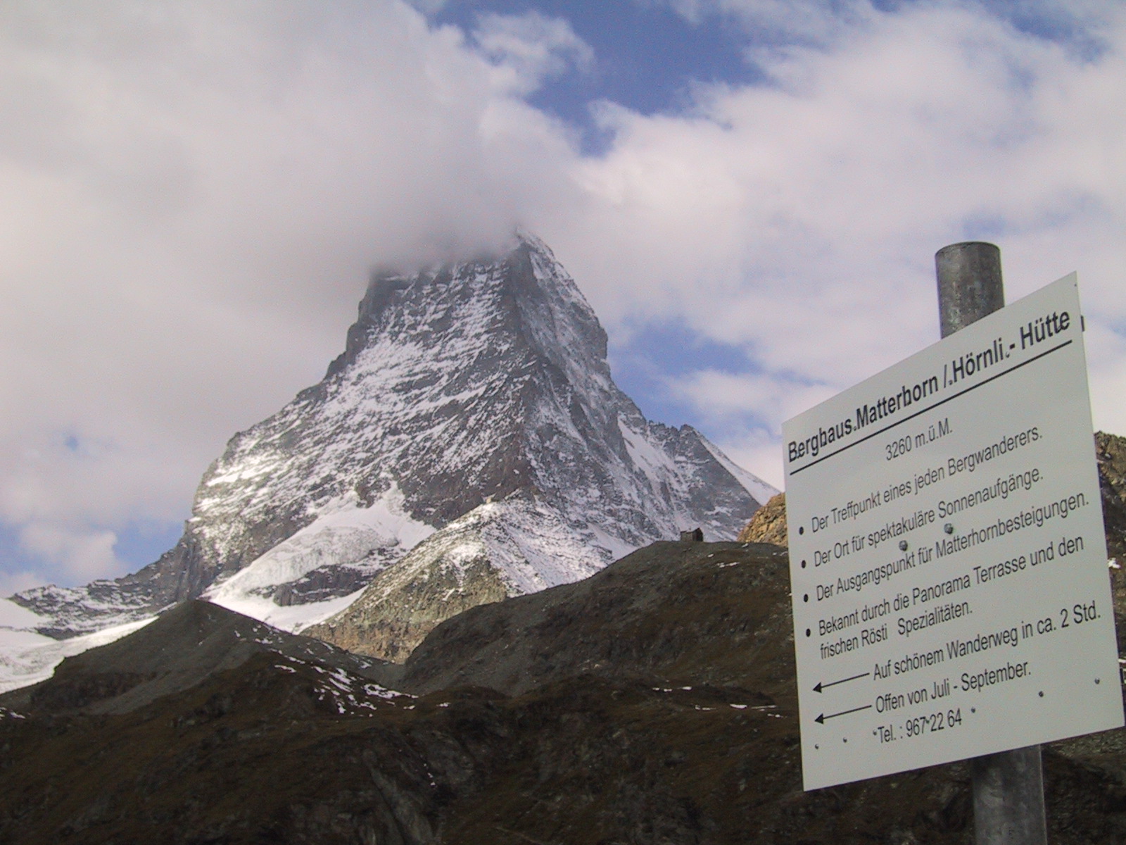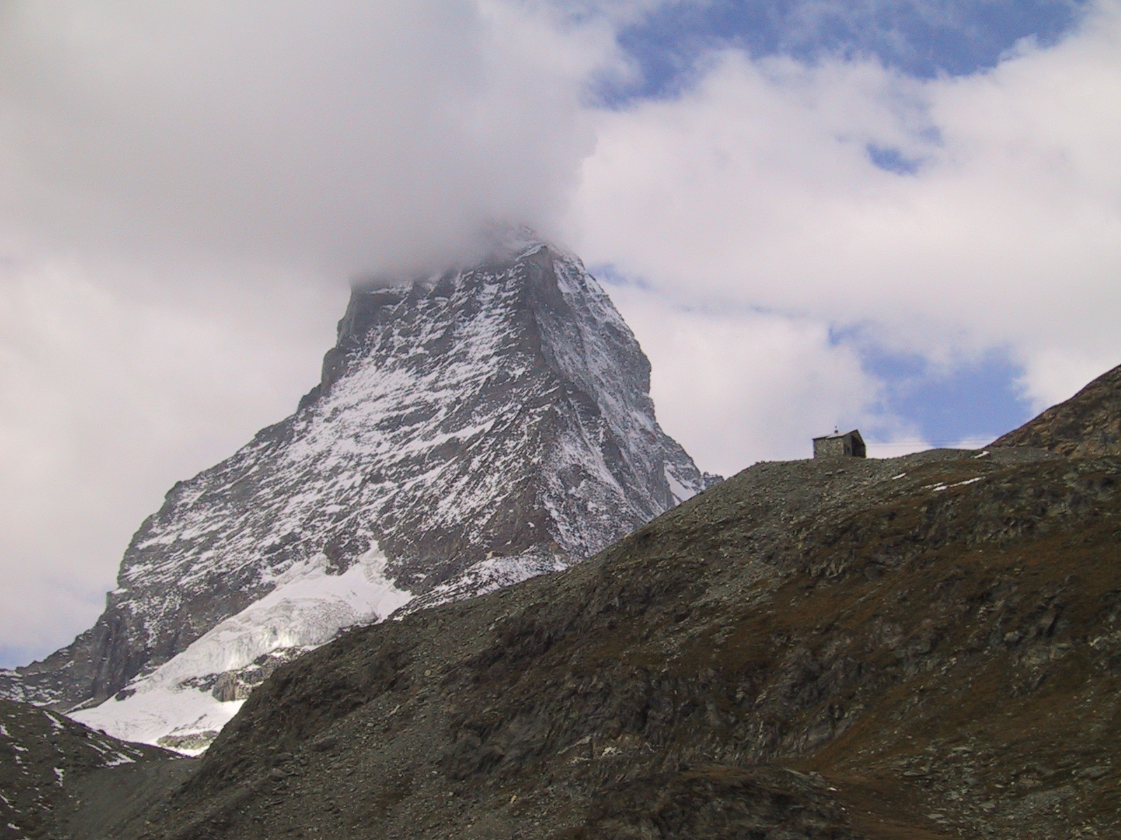 この日は残念ながらあまり天気は良くない。マッターホルンは雲を 被っている。しかし、予定通りマッターホルンのヘルンリ稜にある マッターホルンのベースとなる山小屋、 ヘルンリヒュッテH\:o rnlih\:u tte(3260m)を目指し、 マッターホルンに自分の力で行けるところまで近づくことにする。