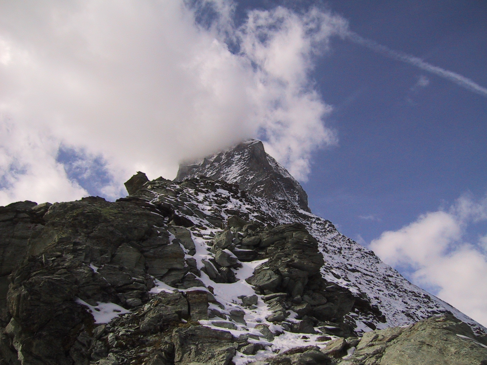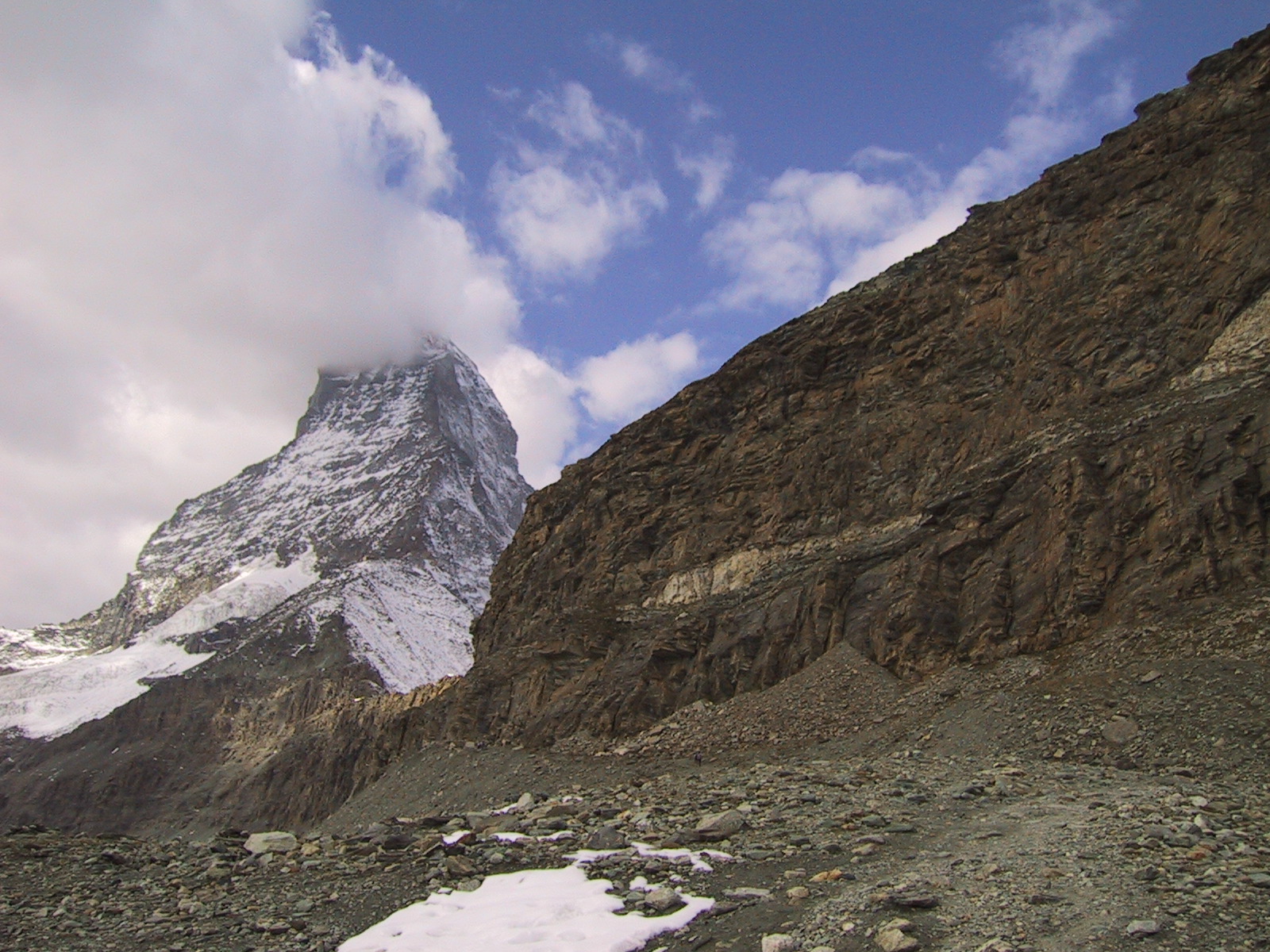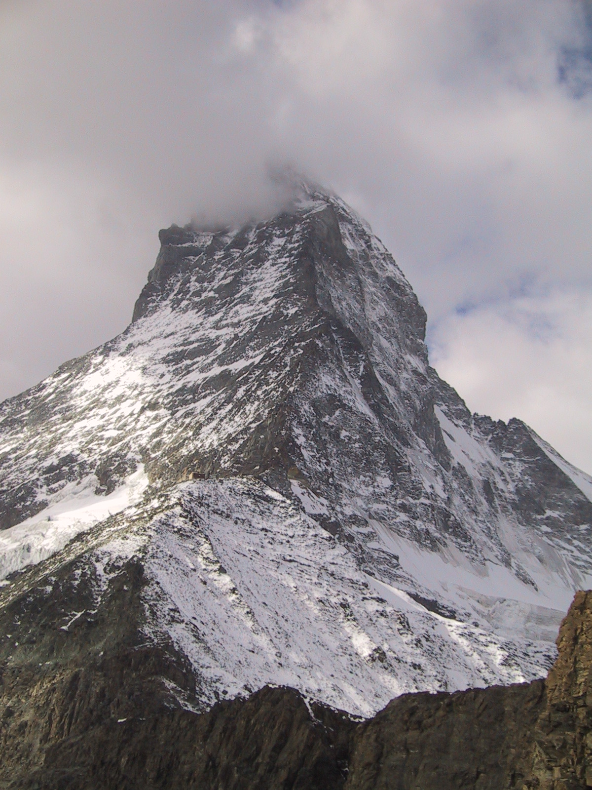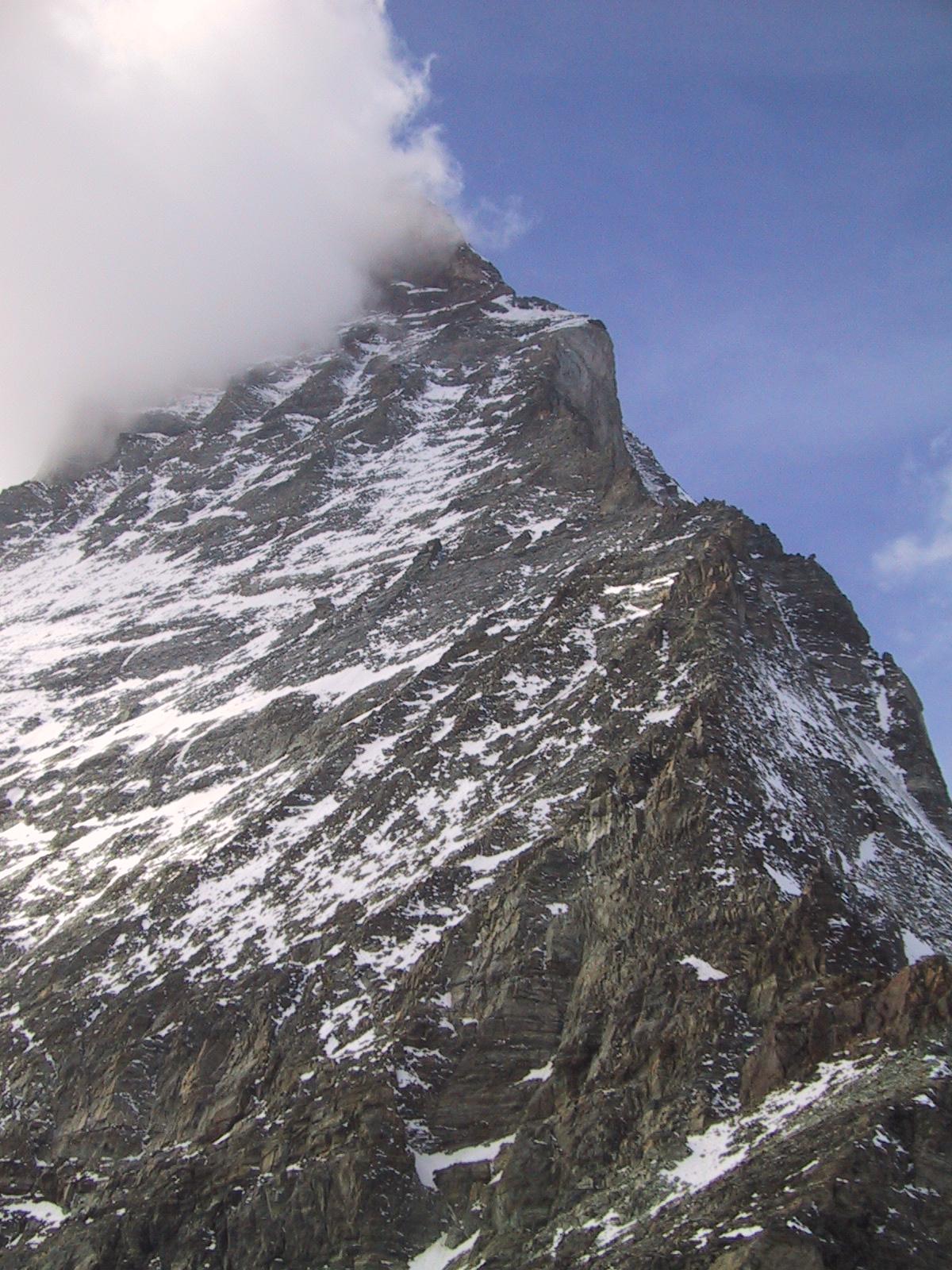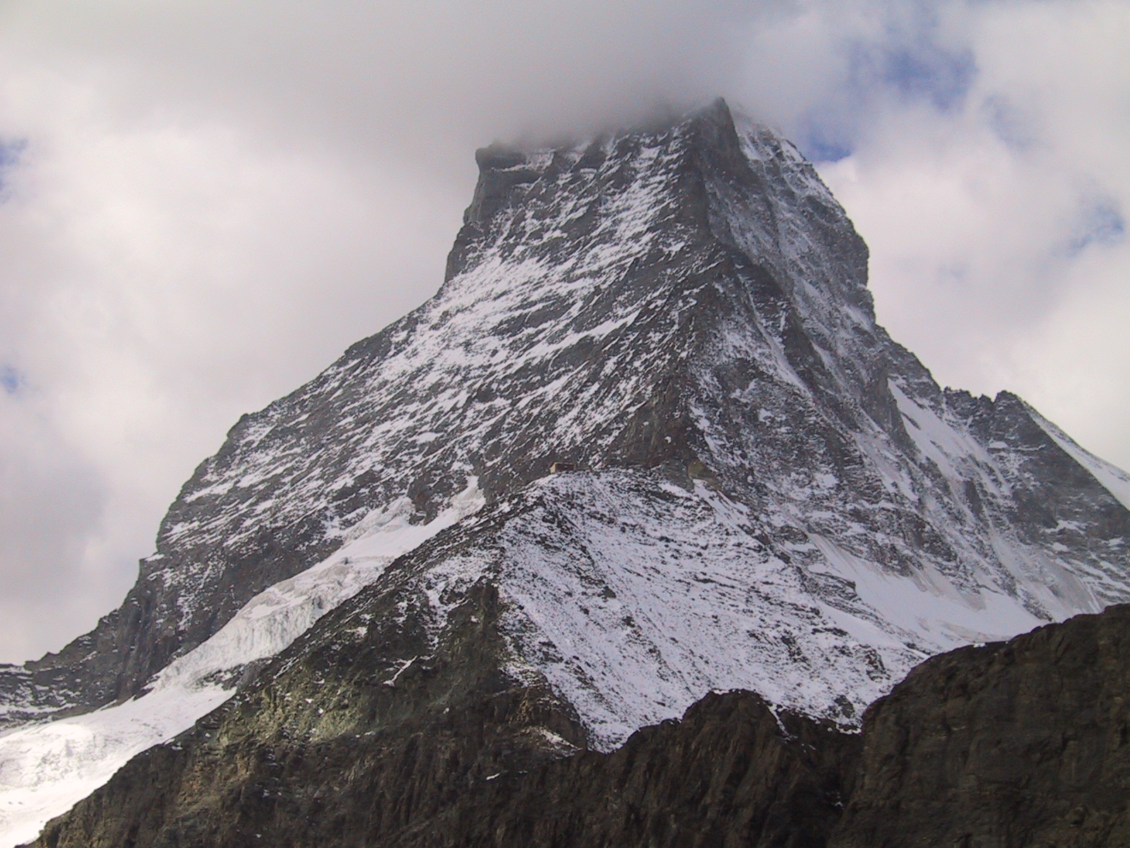 この日は残念ながらあまり天気は良くない。マッターホルンは雲を 被っている。しかし、予定通りマッターホルンのヘルンリ稜にある マッターホルンのベースとなる山小屋、 ヘルンリヒュッテH\:o rnlih\:u tte(3260m)を目指し、 マッターホルンに自分の力で行けるところまで近づくことにする。