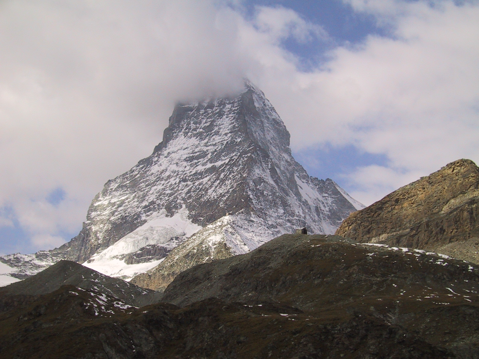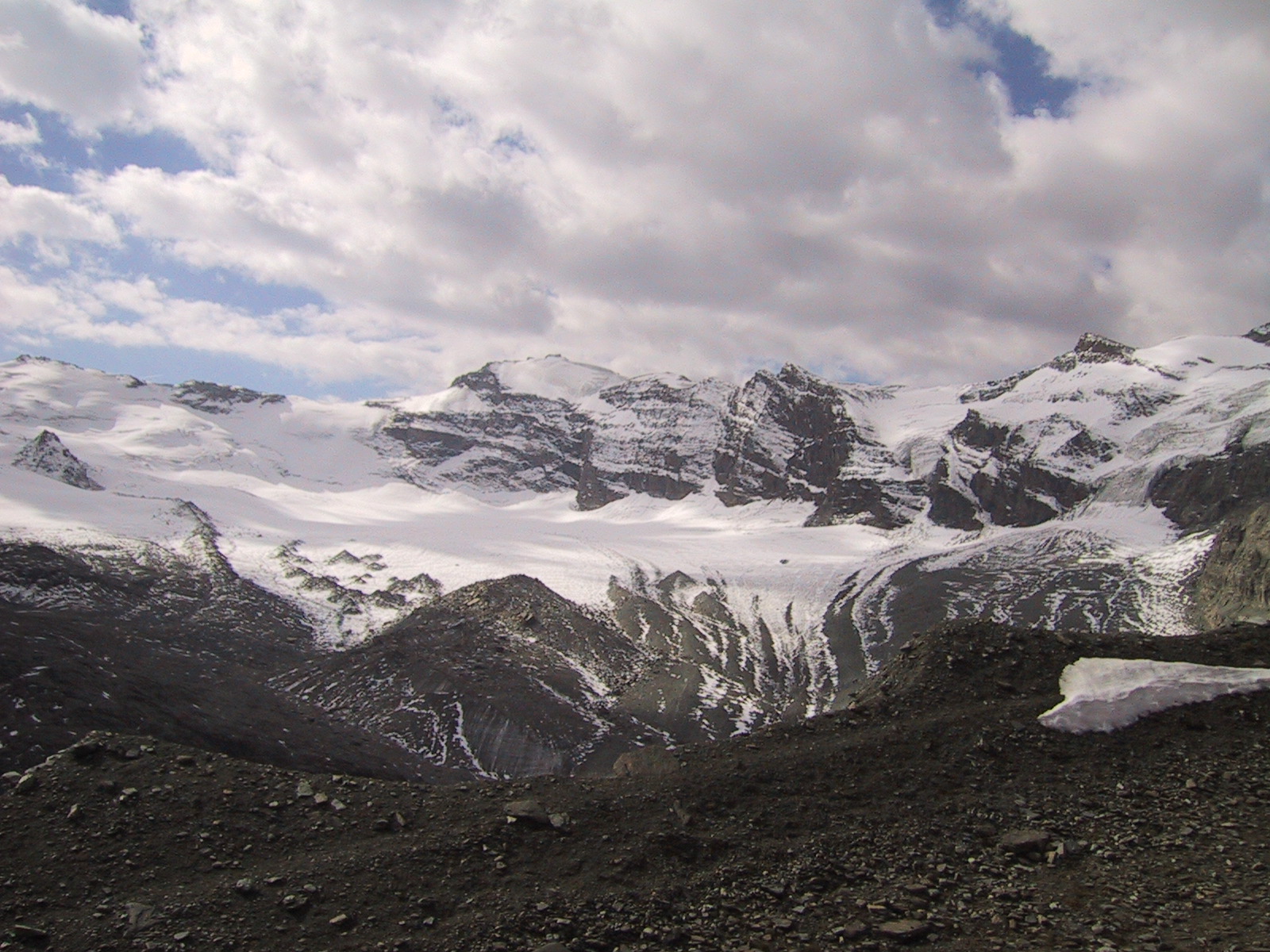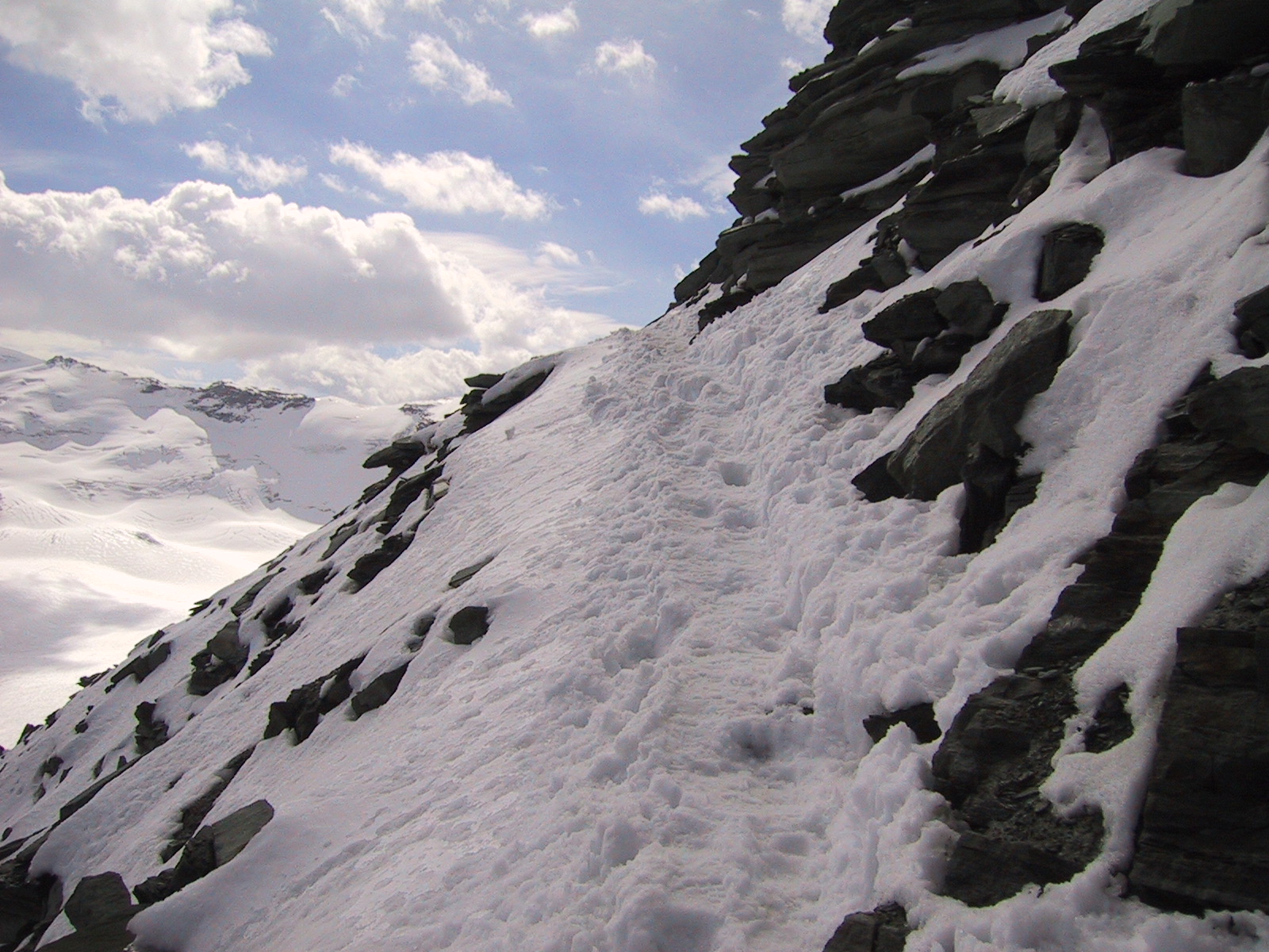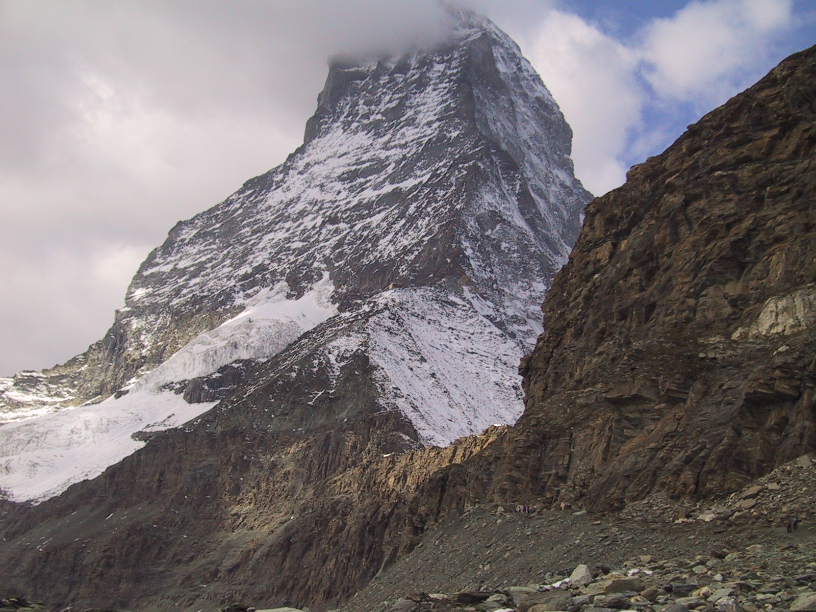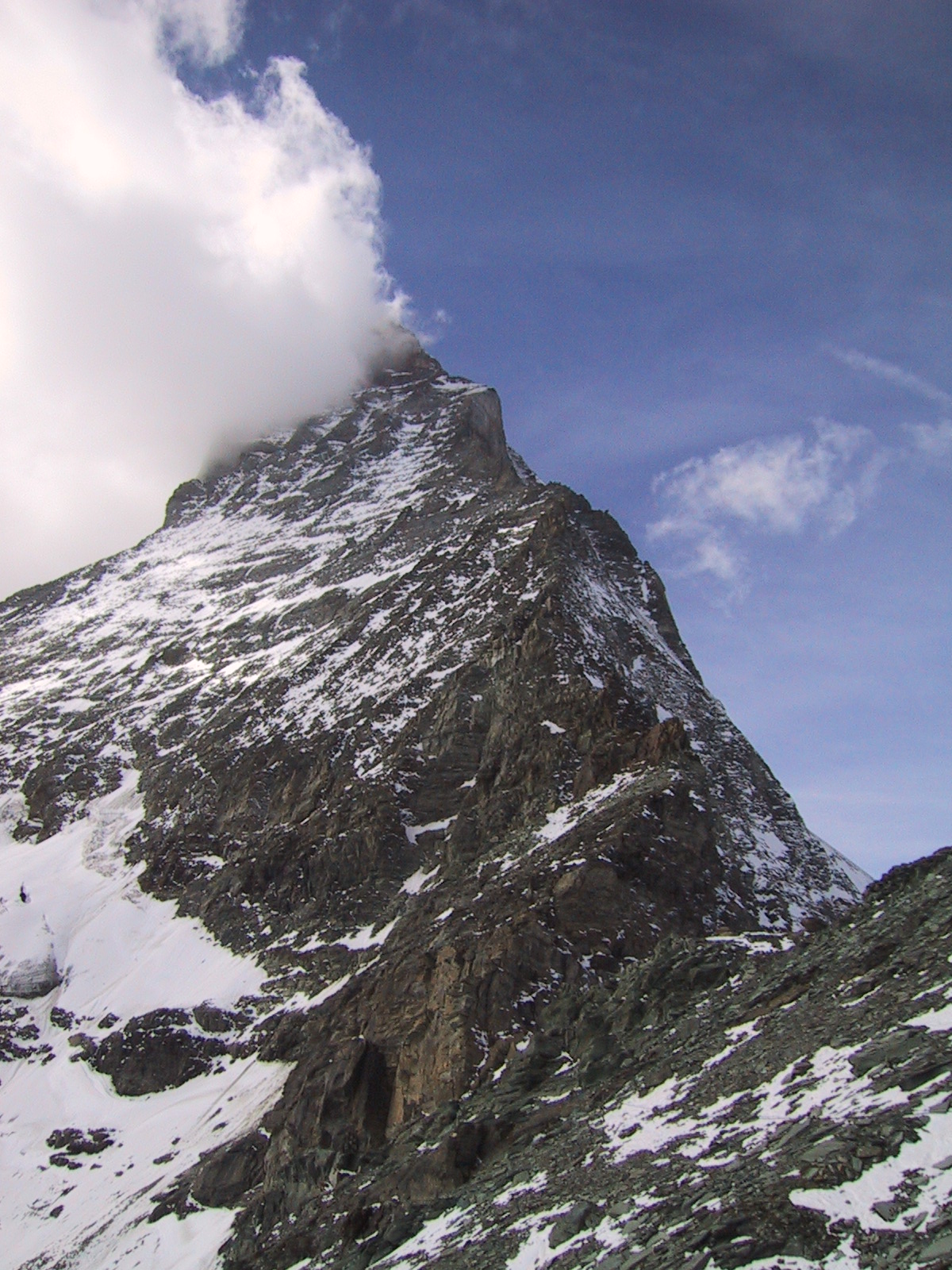 この日は残念ながらあまり天気は良くない。マッターホルンは雲を 被っている。しかし、予定通りマッターホルンのヘルンリ稜にある マッターホルンのベースとなる山小屋、 ヘルンリヒュッテH\:o rnlih\:u tte(3260m)を目指し、 マッターホルンに自分の力で行けるところまで近づくことにする。