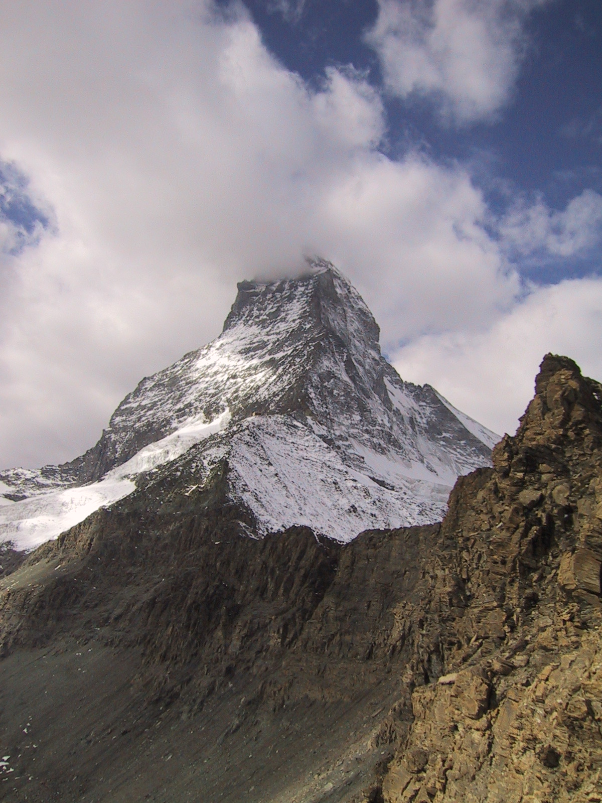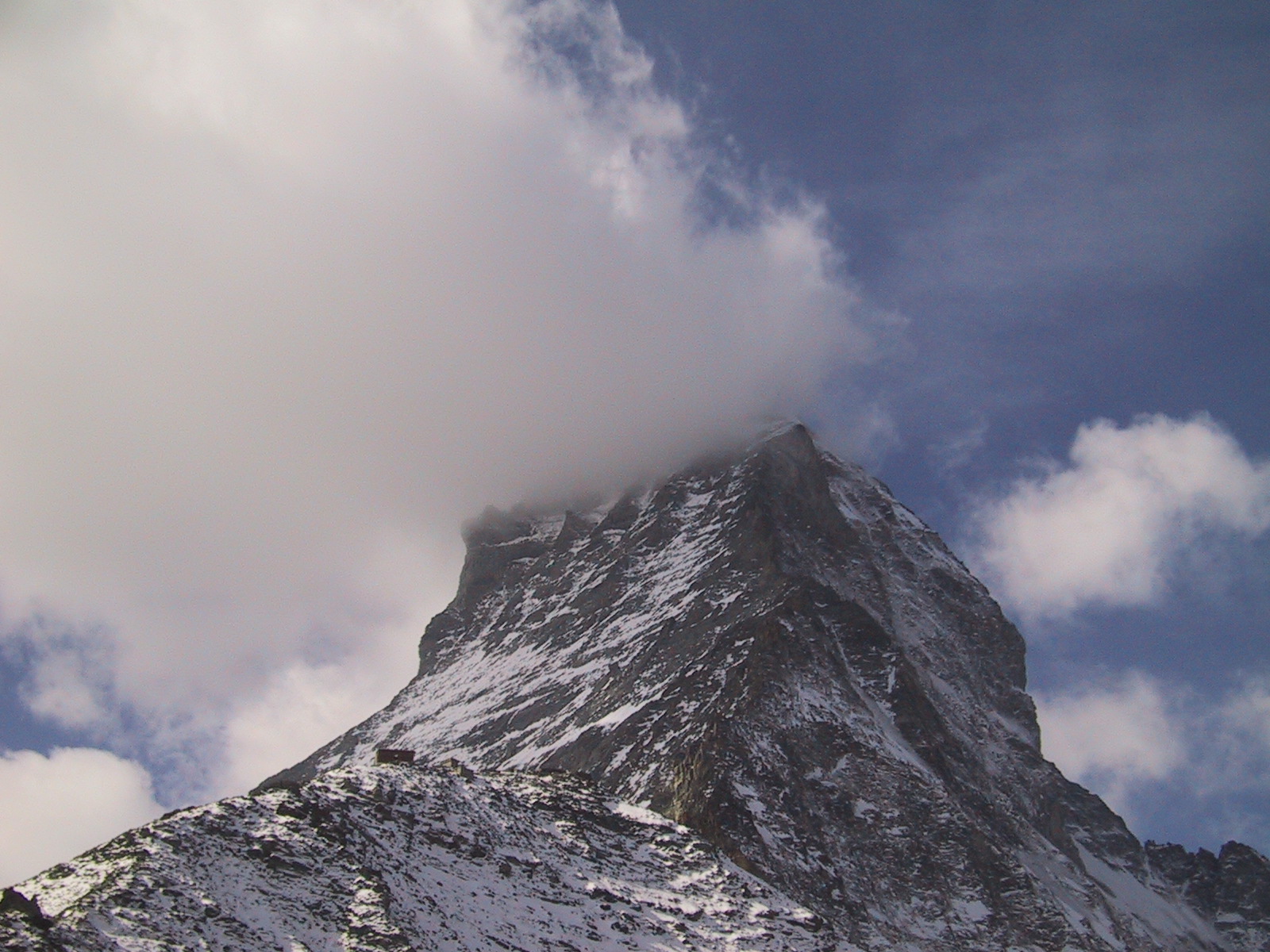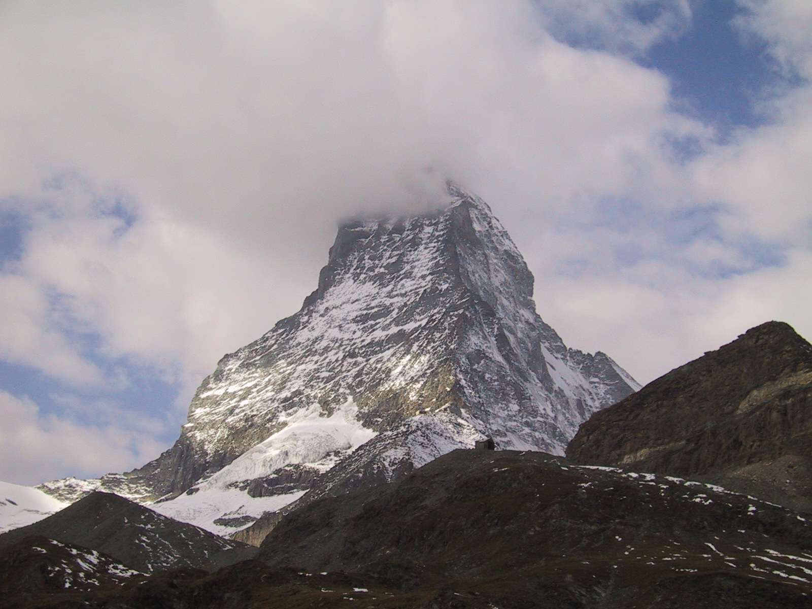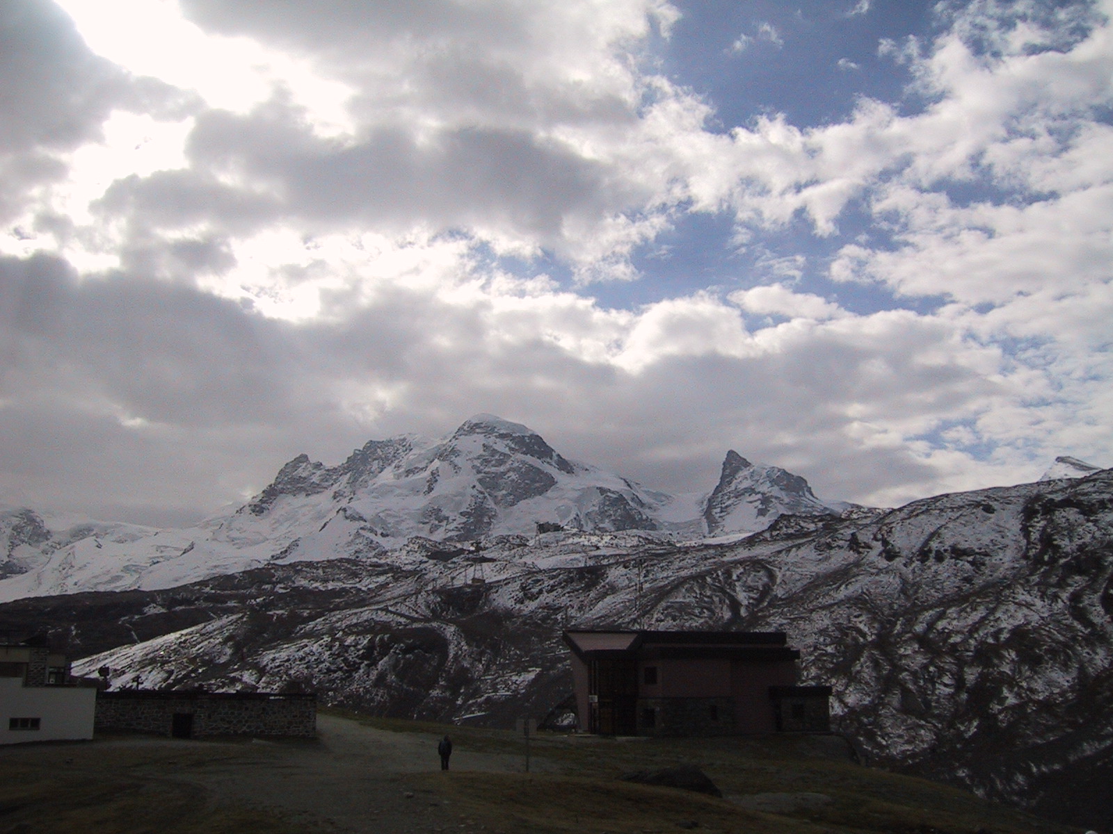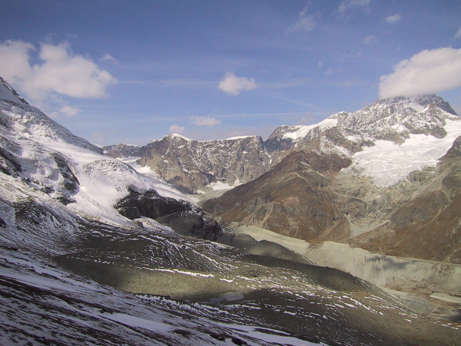 この日は残念ながらあまり天気は良くない。マッターホルンは雲を 被っている。しかし、予定通りマッターホルンのヘルンリ稜にある マッターホルンのベースとなる山小屋、 ヘルンリヒュッテH\:o rnlih\:u tte(3260m)を目指し、 マッターホルンに自分の力で行けるところまで近づくことにする。