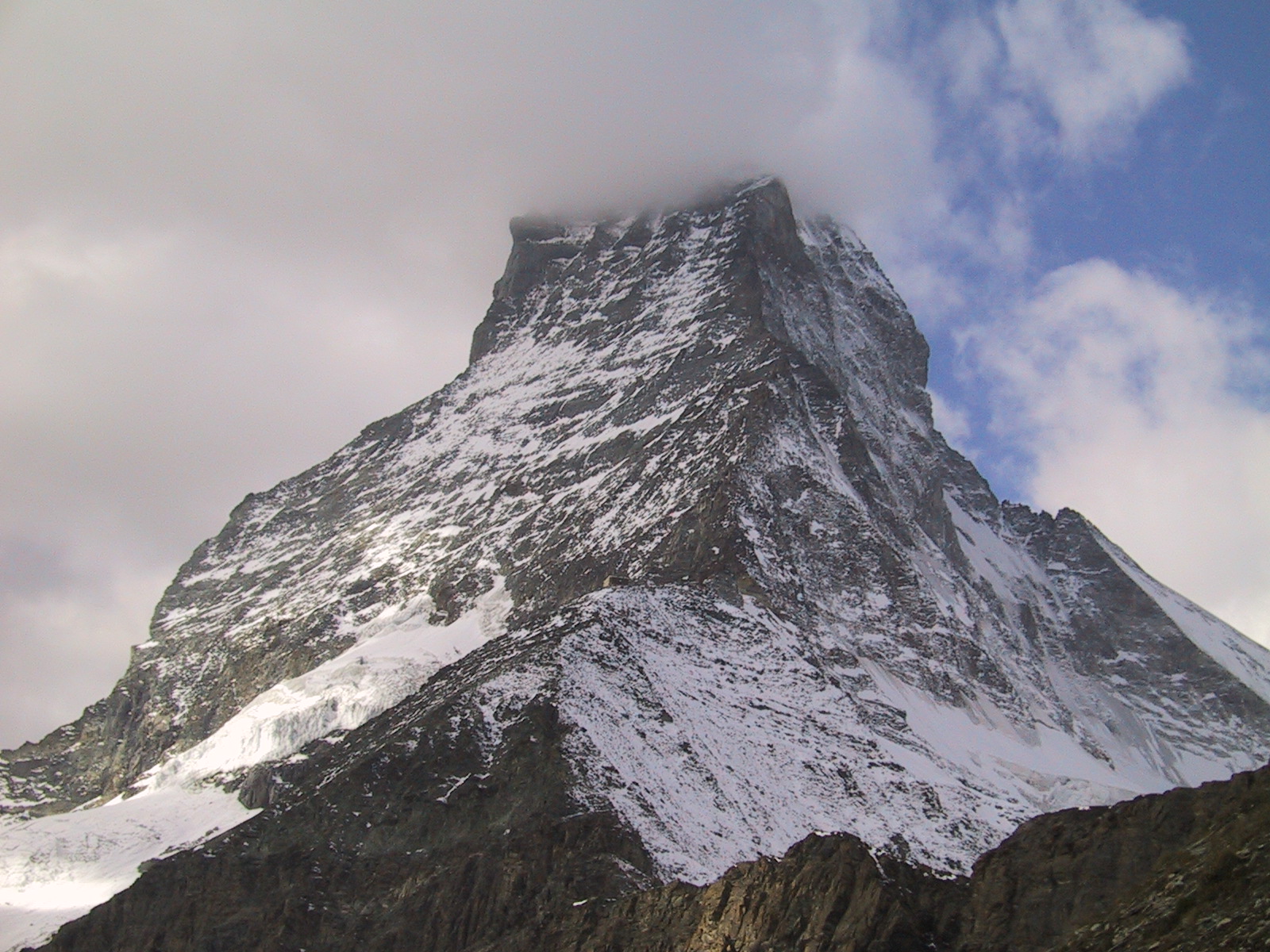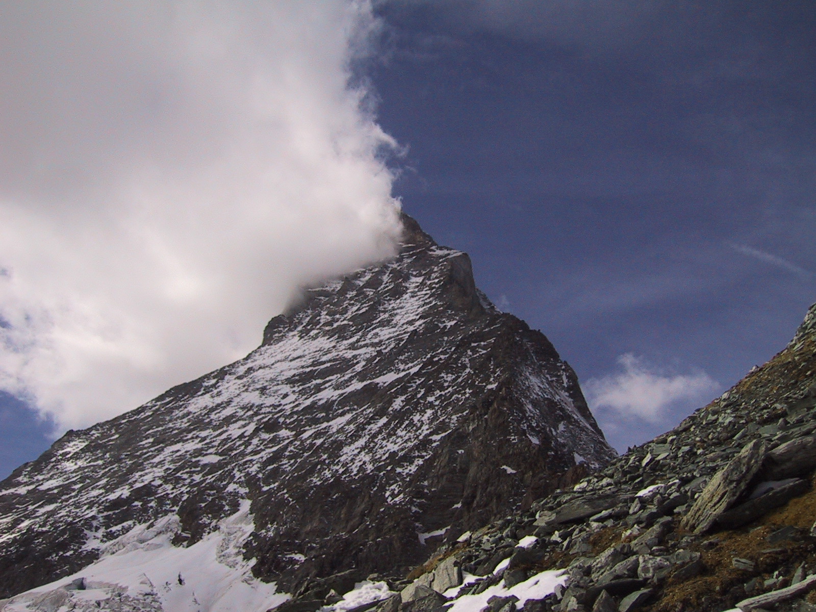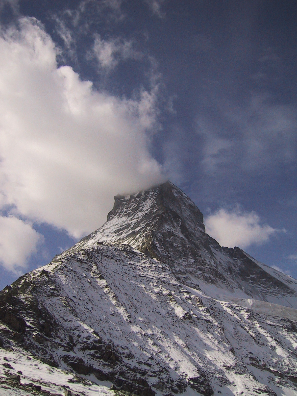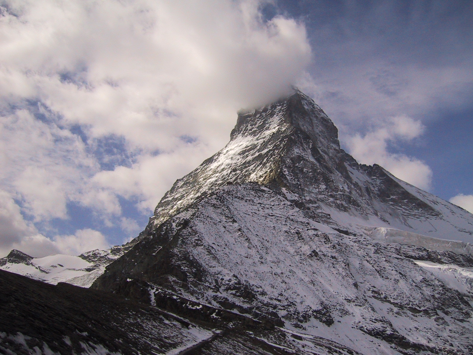 この日は残念ながらあまり天気は良くない。マッターホルンは雲を 被っている。しかし、予定通りマッターホルンのヘルンリ稜にある マッターホルンのベースとなる山小屋、 ヘルンリヒュッテH\:o rnlih\:u tte(3260m)を目指し、 マッターホルンに自分の力で行けるところまで近づくことにする。