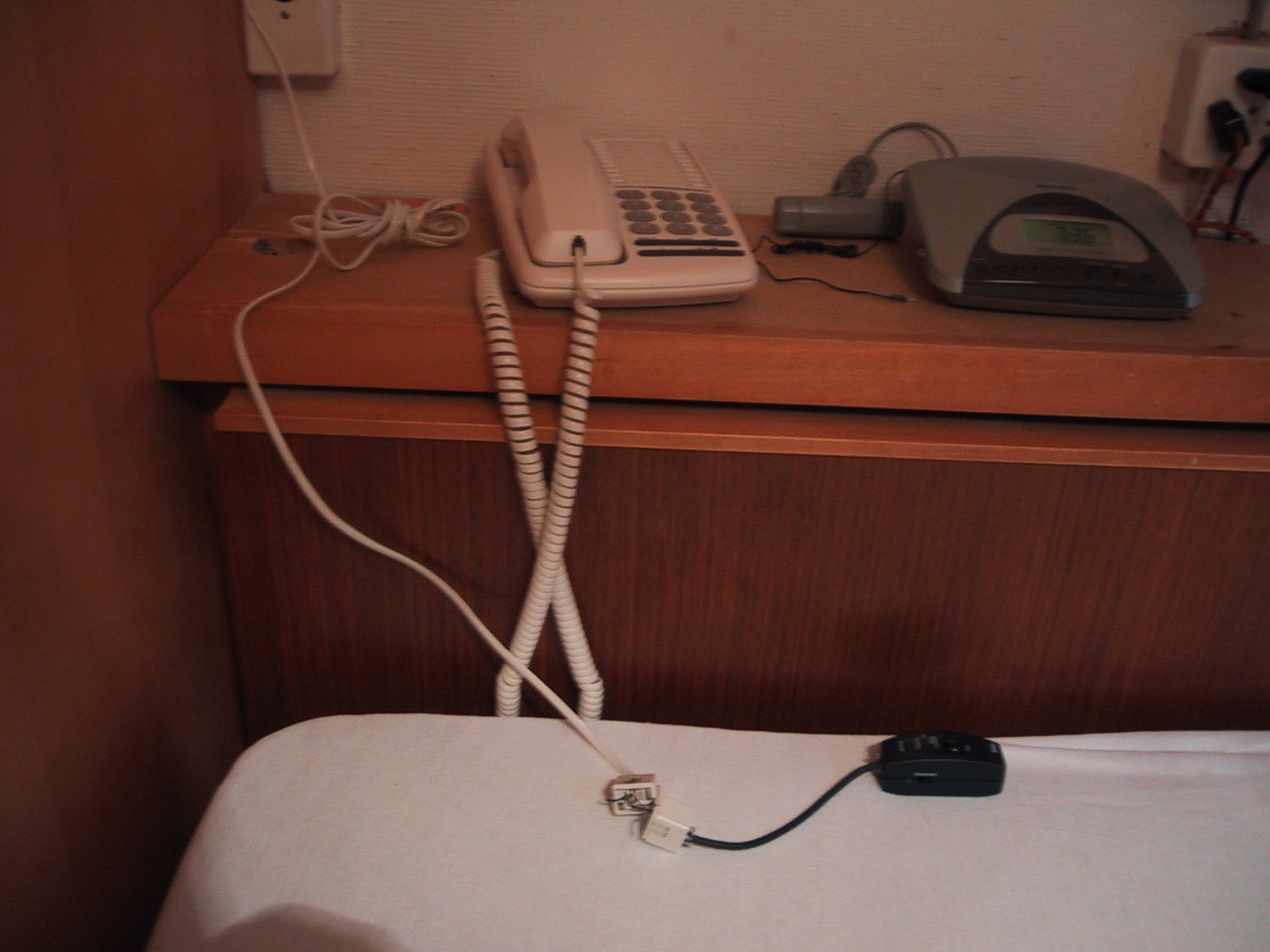 ドイツではミュンヘンでもドレスデンでも簡単に通信に成功したのだが、 スイスでは駄目。2年前もスイスでは成功しなかったのであきらめかけて いたのだが、ふと電話線をよく見ると4線の内片側の2線を使っている ことに気付いた(日本では中央の2線)。そこで、たまたま持ち合わせていた 中継器を分解して結線を変更し、通信に成功!