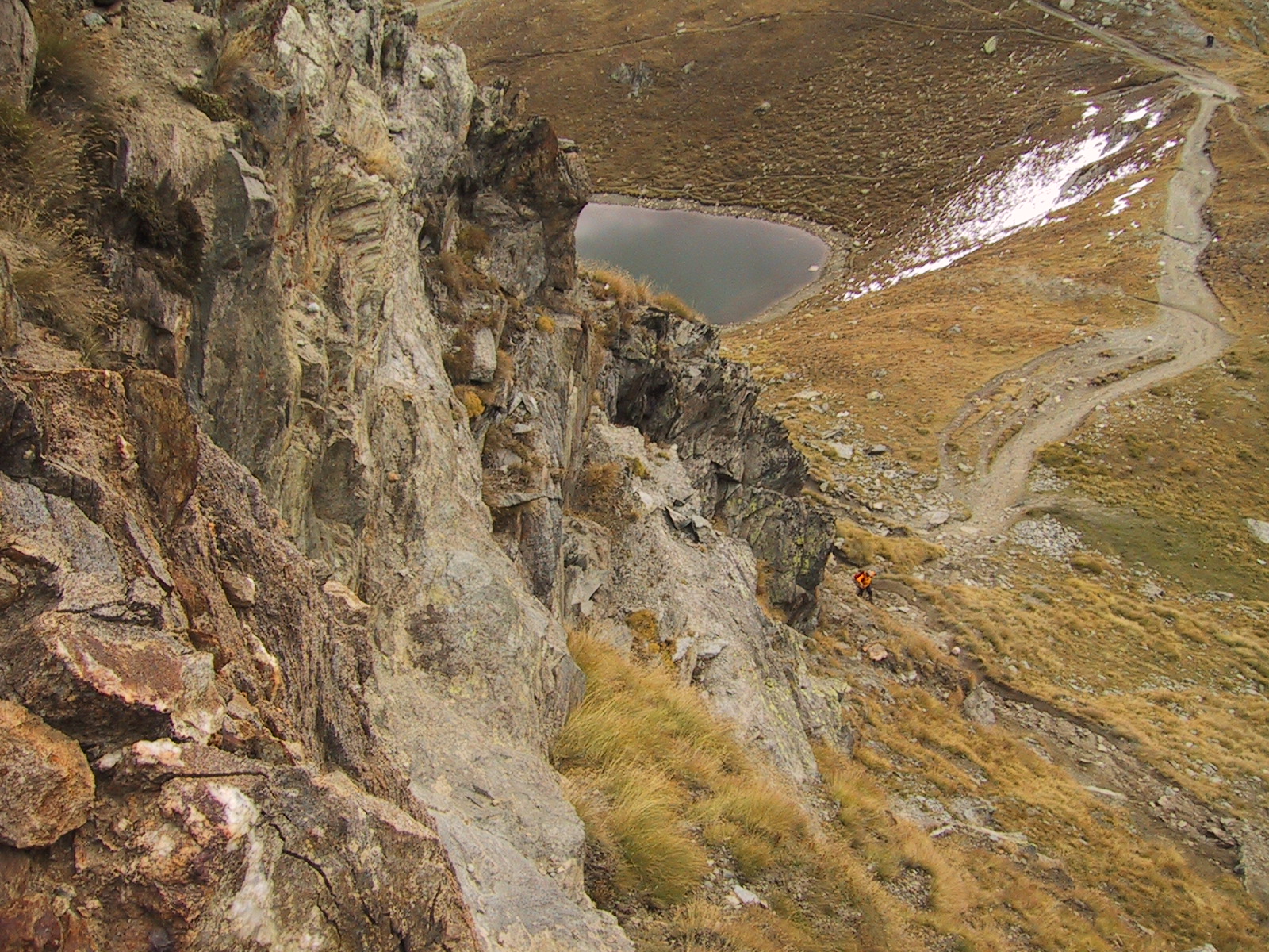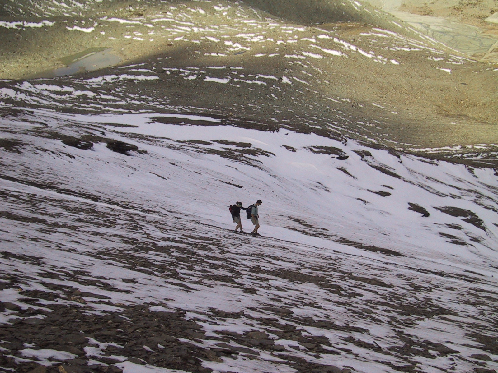 カップルがシュタッフェルアルプStaffelalp方面への急斜面を とても恐そうに下りて行く。アイゼンの無い人は大変だろうなあ。