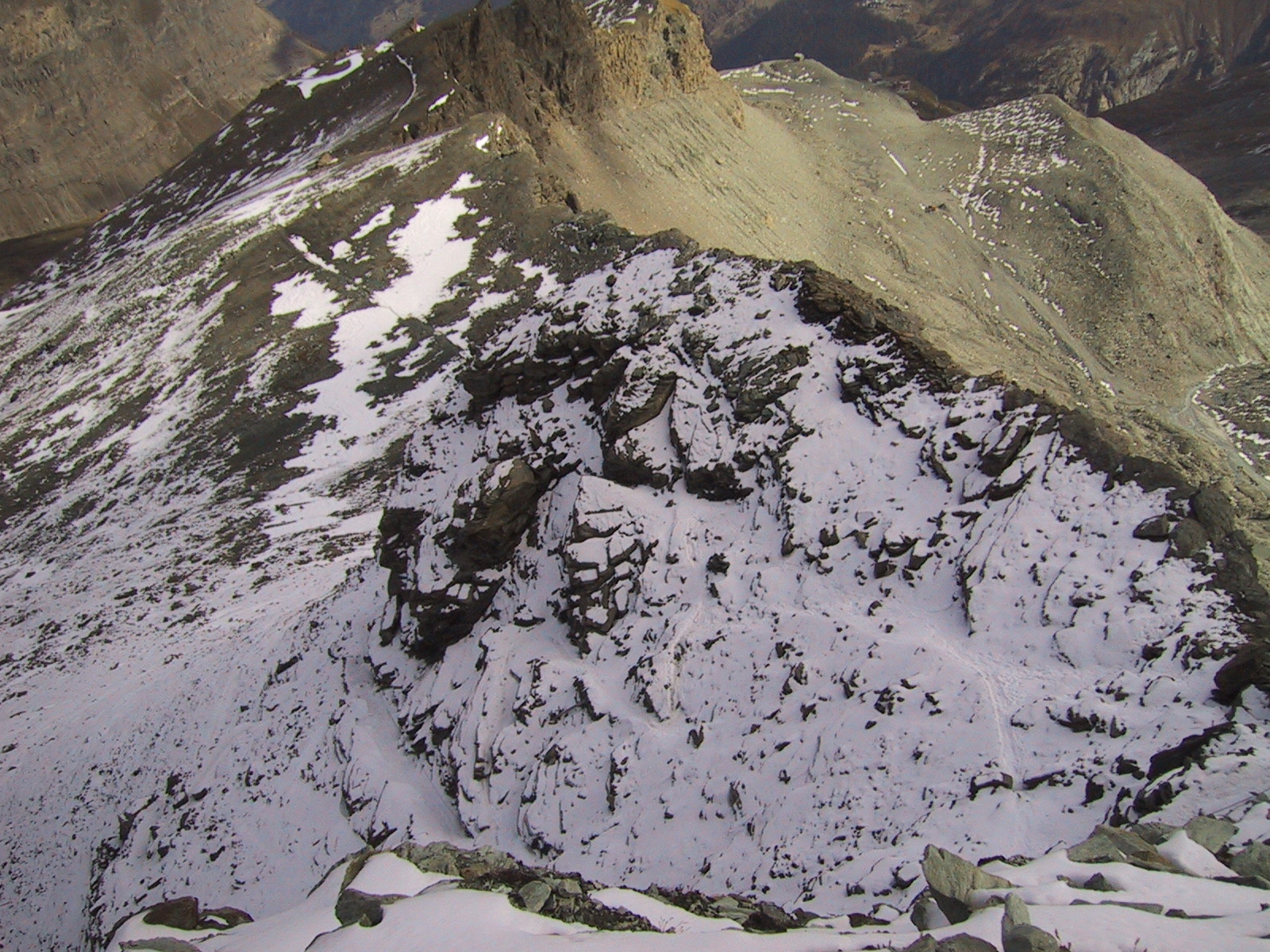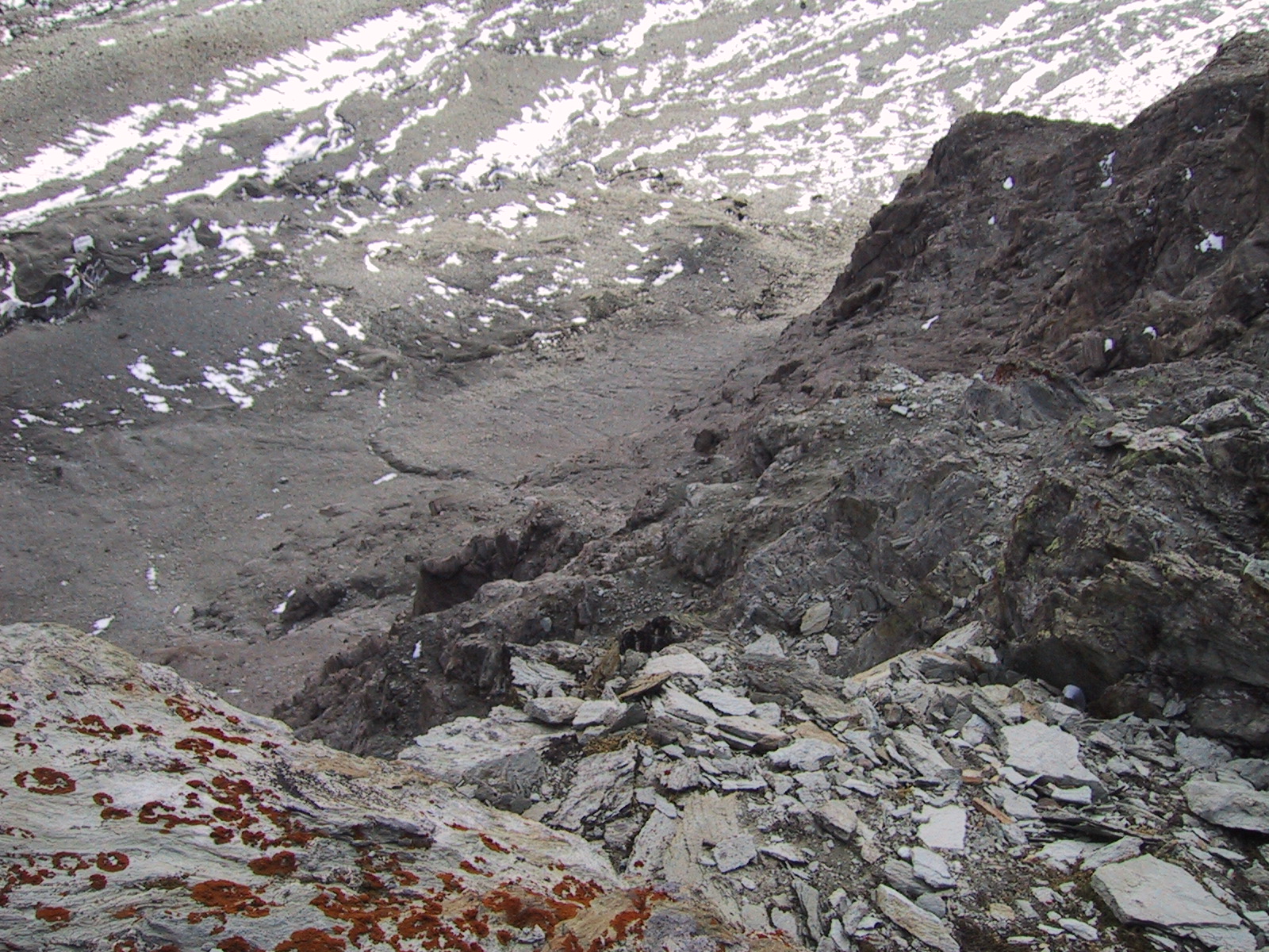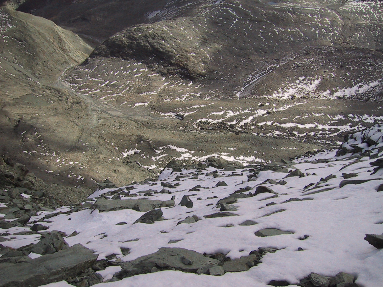 ここからマッターホルン目指して歩き始める。 目的地のヘルンリヒュッテが小さくはるか上に見える (手前に見える小屋ではなく、その奥に小さく見えるのがヘルンリヒュッテ)。